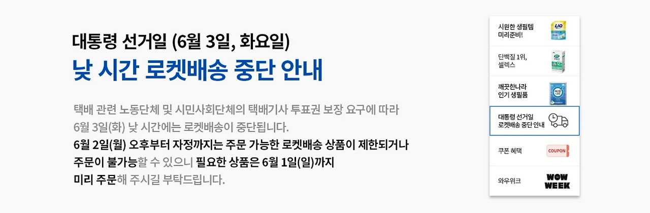 쿠팡이 오는 6월 3일 대선일에 로켓배송을 처음으로 멈춘다고 발표했어요.
