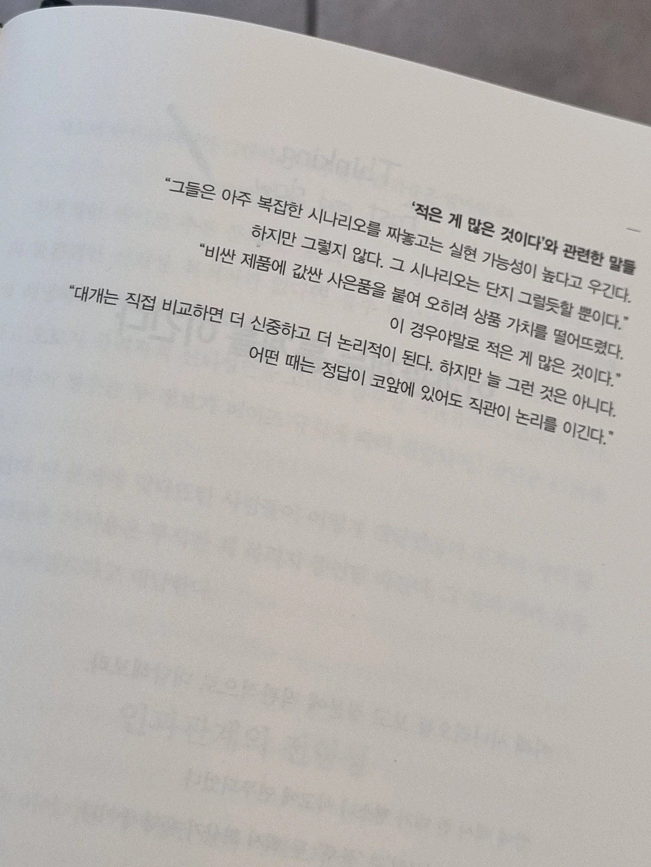 어쨌든 이 책은 더 나은 선택을 내리기 위한 조언을 해 주고 있다. 인간은 편향과 어림짐작, 과신에 사로잡힌 존재라 끊임없이 잘못된 선택을 반복한다. '그러니까 이런 사실을 알려줄 테니, 멍청한 독자들이여 정신을 차리시오'라고 말을 하는 듯했다. 더 나은 판단을 하고, 더 나은 가치를 창출하길 기대한다.