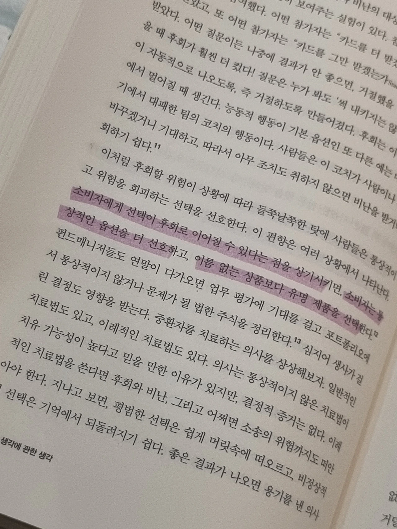 사람들은 똑 같은 결과를 두고도 행동하지 않음으로써 그 결과가 생겼을 때보다 행동함으로써 그 결과가 생겼을 때 (후회를 비롯해) 더 격렬한 반응을 보인다. (P.511)
