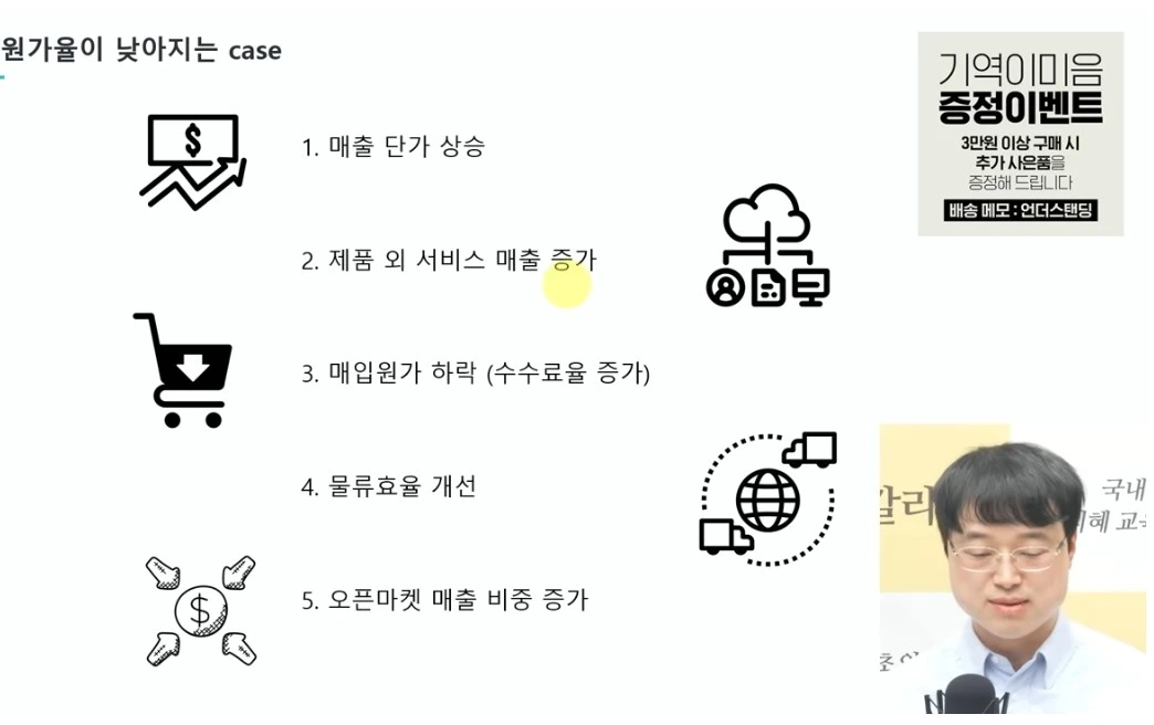 매출 원가율이 낮아지는 이유에 대해서 위와 같이 5가지 사례를 설명해 주셨어요. 그중에 회계사님은 3번을 주 이유로 보고 계신 것 같았습니다.
