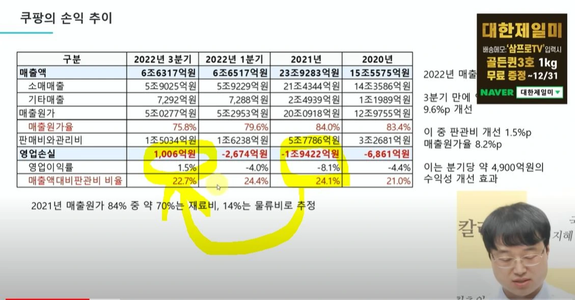 저의 개인적 생각도 역시 3번 부분, 매입원가 하락이 가장 큰 요인으로 생각됩니다. 최근 CJ와의 햇반대첩도 큰 이슈가 되었듯이 쿠팡과 제조사 간의 공급가 줄다리기가 이어지고 있습니다. 2022년에 쿠팡의 점유율이 높아지면서, 헤게모니가 쿠팡 쪽으로 좀 더 기울지 않았을까 생각됩니다.