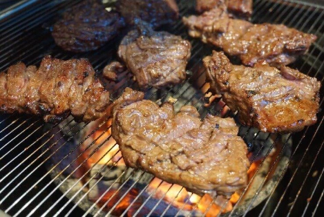 갈빗살은 보통 갈비뼈와 뼈 사이에 있는 늑간살을 이야기하며, 손가락 모양으로 기다란 고기라 하여 Rib Finger Meat라고도 합니다. 갈빗살은 양념장(Marinade)에 일정 시간 재워놓는 숙성을 통해 양념장 재료들과 고깃살 사이의 깊은 맛이 우러나게 합니다. 저는 숯불에 갈빗살을 굽는 것을 선호하는데, 식품연구원 실험에 따르면 숯불은 프라이팬이나 돌판에 비해 가열 감량과 전단력이 낮고, 수분함량이 높아진다고 합니다. 가열 감량(weight loss on heating)이 낮다는 말은 어느 물질이 가열됨으로써 생성하는 질량의 감소가 낮다는 말로 육즙의 감소량이 적다는 뜻입니다. 아울러 전단력(Shearing force)이 낮다는 말은 더 낮은 힘으로 절단 가능하다는 말이며, 이는 부드러워 먹기 더 편하다는 뜻입니다. 마지막으로 숯은 중간에 프라이팬이나 돌판 등의 매개체가 없어 복사열이 전달되어 고기 자체의 수분함량이 높아져 부드러워고 풍부한 맛을 지니게 한다는 장점이 있습니다. (각주 1) 그래서 전 가능하면 갈빗살은 숯불에 구워주는 곳을 선호합니다.