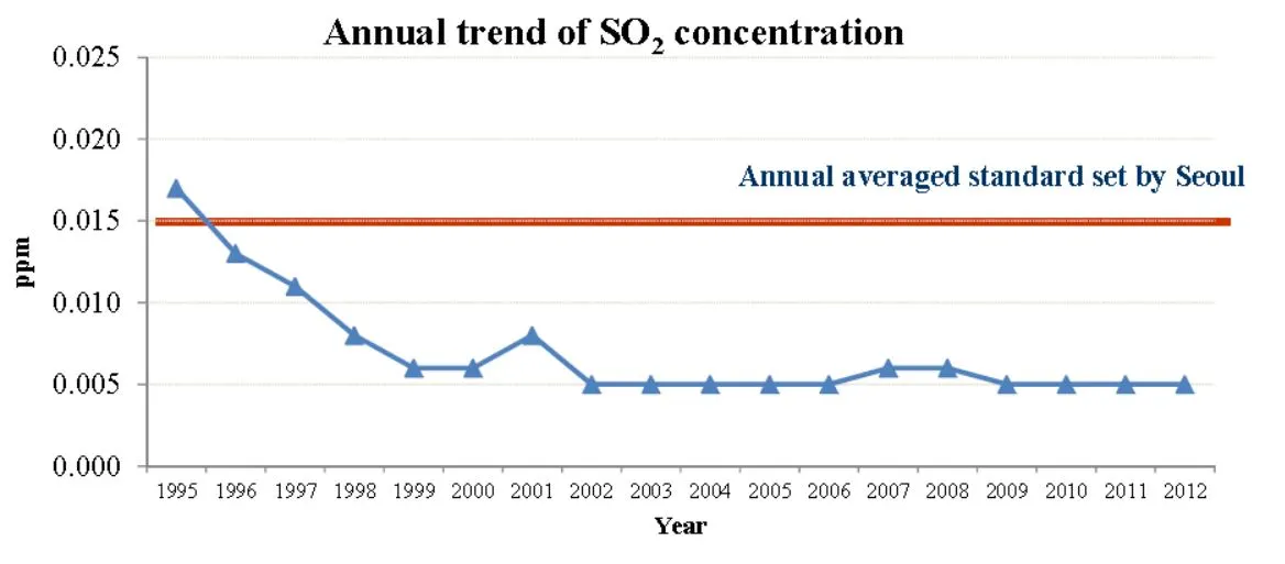 서울시 산하 서울연구원에서는 2014년 제11차 Metropolis World Congress에서 'Seoul's Efforts to Tackle Air Pollution'이라는 자료를 제시했다. (미주 참조) 여기서는 서울과 다른 대도시, 한국과 다른 국가들을 비교해 가며 서울의 대기질 현황을 보여주며, 시계열로 각 측정지표들을 보여준다. 16페이지 정도 되면 내가 궁금했던 SO2의 ppm이 등장하는데, 이는 다음과 같다.