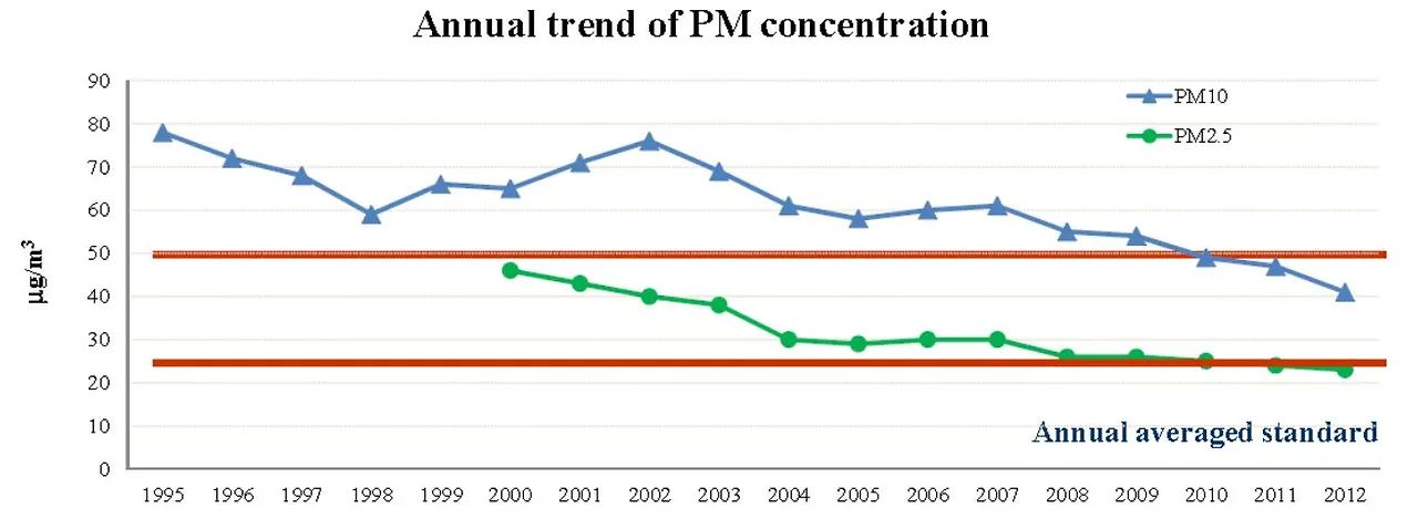 측정을 시작한 95년 이래로 다소의 변화는 있지만 대체적으로 우하향의 그래프를 보여주고 있다. 상기 그래프 상으로 역대 최악은 PM10도 PM2.5도 2000년대 이전에 발생하고 있지 2010년대 이후에 발생하지는 않는다. 물론 인류의 출현으로, 그리고 산업혁명의 출현으로 지구는 다소의 몸살을 겪었다. 하지만 개인적 관점에서 보자면 그 수준은 20세기 중반에 정점을 이루었고, 점차 더 나은 기술과 규제를 통해 오염의 정도를 점차 낮추어가고 있다고 생각한다.
