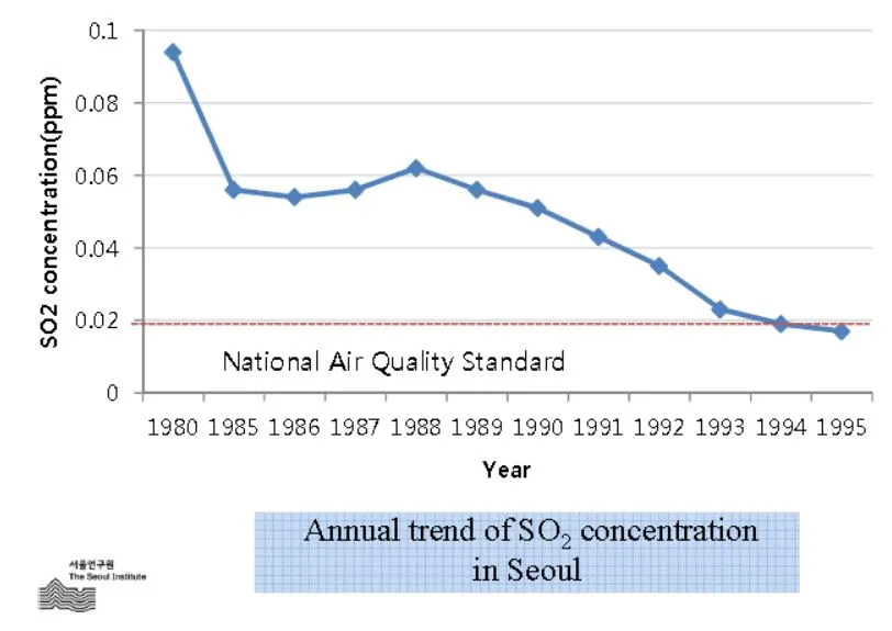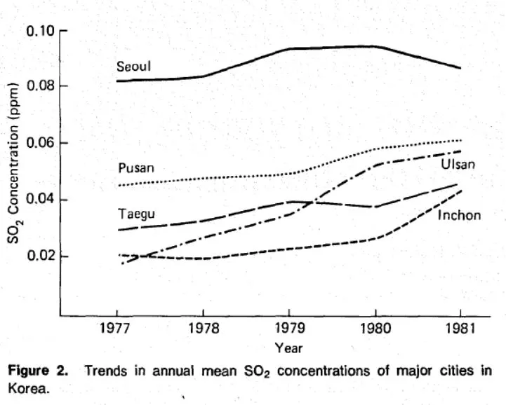 구글링을 통해 1984년 텍사스 대학에서 공중보건을 전공하신 김윤신 님의 논문을 읽게 되었는데, 이 논문을 보면 그 당시 한국의 아황산가스(SO2 concentration) 농도를 확인할 수 있다.