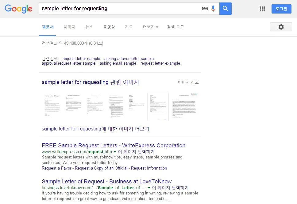 이때 래리페이지가 준 선물, 크롬을 열어 봅니다. 일단 크롬 창을 띄우고 주소창에 타이핑하기 시작합시다. 'Sample letter for requesting' 그럼 지구 반대편의 다양한 분들이 친절하게도 샘플 레터를 무수히 많이 만들어 놓은 게 보입니다. 일단 눈으로 스윽~ 한번 훑어보고, 대충 내가 쓰고 싶은 내용이랑 비슷한 레터를 가져옵니다. 그리고 위아래의 형식을 일단 맞춰주고 시작합니다.
