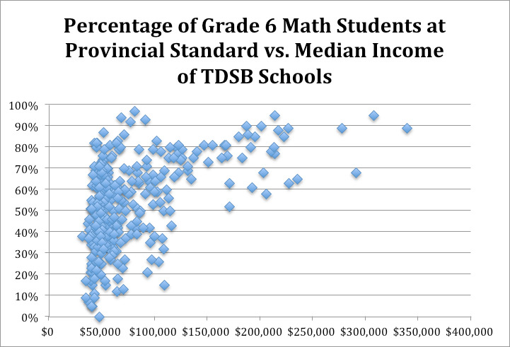 이는 TDSB라 하는 토론토 교육청(Toronto District School Board) 자료를 기반으로 작성된 것인데, 수평축은 해당 학교 가정의 중위소득, 수직축은 6학년 학생들의 주 표준 이상 비율을 나타낸다. 그러니까 중위소득이 연간 15만 불 이상(2018.09.02 기준 한화 약 1억 2천8백만 원)으로 가면 50% 이상 비율의 학생들이 주표준점수를 넘게 된다. 5만불대에 이르면 심지어 0%도 존재한다. 반면 매우 부유한 지역의 학교는 거의 90%에 육박하는 수준의 학력 아이들이 분포함을 알 수 있다.