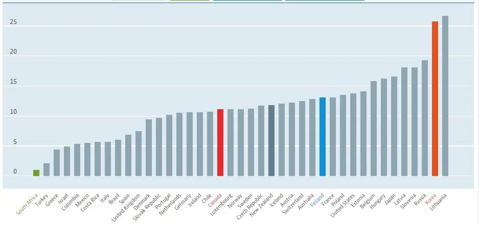 다음의 표를 보자. 이는 2016년 OECD에서 집계한 인구 100,000명당 자살하는 사람의 비율인데 한국의 수치가 비교적 높은 편이긴 하지만, 핀란드나 캐나다와 같은 나라도 자살하는 사람이 없는 것은 아니다. 대략 한국에 비해 절반 혹은 그 이하수준일 뿐이지. 사실 자살률로 국가의 가치를 설명하기는 어렵다. 그렇게 따지자면 저 0명에 근접한 남아프리카 공화국이나 터키와 같은 나라가 이상적인 국가일 텐데, 사실 남아공과 같은 나라는 자살이 아니라 타살로 인생을 마감하는 확률이 더 높을 것이다. 여하튼 여기서 요지는 완벽한 나라는 없다는 말이다.
