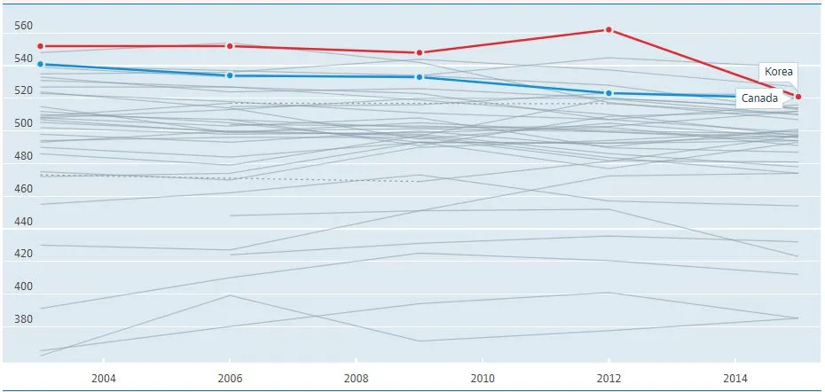 여기까지 이야기했는데 그래도 납득이 안 되는 분들이 계실 수 있다. 캐나다 그 온타리오 주의 기준이 높아서 저러한 문제가 발생하는 것 아니냐고. 그래서 마지막으로 OCED에서 3년마다 평가하는 PISA 수학 부분 순위를 한번 가져와봤다. 뭐, 한국이 2015년에 많이 떨어지긴 했으나 그래도 캐나다보다는 한국 아이들의 수학 실력이 아직까지는 캐나다보다는 높다. (참고로 한국의 2012년 기준 PISA 수학 실력은 전 세계 1등이었다)