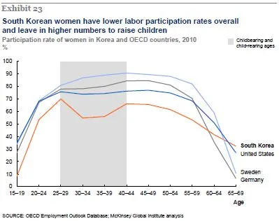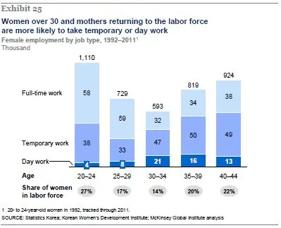 상기 그래프는 맥킨지;McKinsey에서 작성한 한국 여성의 노동참여에 대한 두 가지 조사 결과다. 소스는 OECD 및 통계청 자료이고 한국에서 발생하는 독특한 현상을 잘 보여준다. 그래프는 여성들의 연령별 노동참여 비율을 보여주는데, 타 선진국에 비해 한국은 20대 후반에 접어들면 노동참여 비율이 현저히 떨어진다. 이는 30대 후반부터 다시 취업을 하는 양상으로 바뀌기는 하지만 아래 표를 보면 한국 여성의 재취업 시기인 30대 후반에는 비정규직 및 일용직(Temporary work & Day work)의 비중이 50%가 넘는 것을 볼 수 있다.