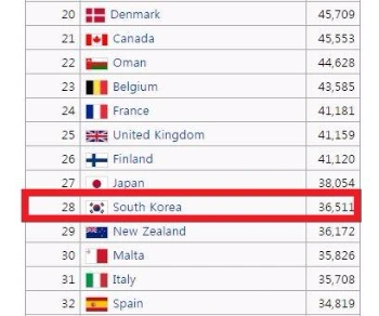 우리나라의 2015년 IMF 기준 구매력 고려 1인당 GDP는 3만 6천 불로 일본에 이어 28위이다. 인구가 극히 적은 소국을 제외하고 제일 높은 나라는 5만 5천 불 규모의 미국이다.