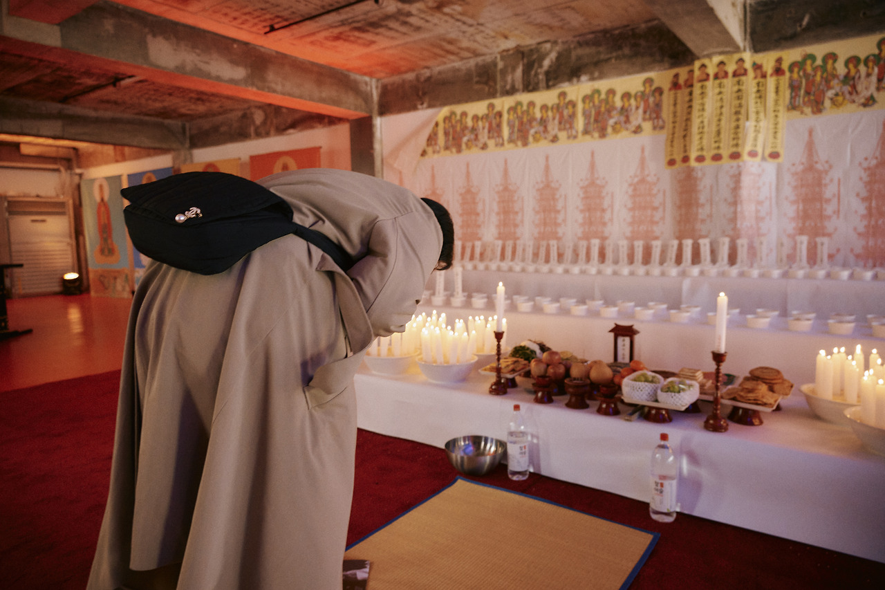 공간은 전시장과 무대로 나뉘어 있다. 2층 전시장에 들어서는 순간, 평소 관념으로만 떠올리던 죽음이 눈앞에서 형태를 갖춘 듯한 느낌을 받는다. 죽음을 실체로 확인하는 방식은 두 가지다. 하나는 명(命)을 다한 육체이며, 다른 하나는 쓰임을 다한 명(名)이다. 이곳 <극락전>에서는 위패에 새겨진 이름을 통해, 관념 속에 머물던 죽음을 시각적 실체로 체감할 수 있다. <극락전> 위에는 죽은 자와 산자의 위패가 놓이고, 열 명의 심판관(시왕十王)이 이를 둘러싼다. 망자들은 전생의 업보를 지닌 채 심판관 앞에 서고, 나는 그 장면을 마주하는 동안 자연스레 스스로의 삶과 죄를 돌아보게 된다.