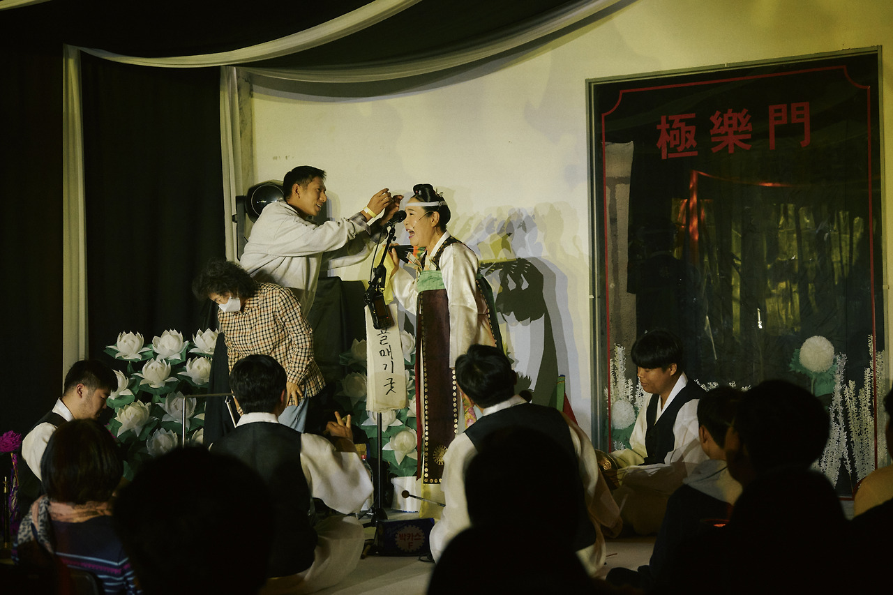 진짜 ‘무당’들이 무대 위에 존재감을 드러낸다. 방지원을 필두로 늘 함께하는 민경문이 그러하며, 이번 공연에서는 몇몇 눈에 띄는 젊은 연주자들의 활약도 주목할 만하다. 요즘 다양한 무대에서 기량을 발휘하고 있는 차루빈과, 동해안 가락을 충실히 연주한 강경훈 또한 예상치 못한 성취를 보여주었다. 동해안 무속 음악은 본래 높은 연주력을 요구하는 음악이다. 완벽한 연주를 기대한 관객에게는 다소 아쉬움이 있을 수 있으나, 연주에는 약간의 어긋남과 투박함이 존재했음에도 절차에 충실하며 행복하게 연주하는 연주자들의 모습에서 ‘정형화된 완벽함’을 요구하는 잣대는 불필요하다. 오히려 이러한 작은 어긋남은 적막 속에서 숨조차 내기 힘든 공연장과 달리, 관객에게 크나큰 자유로움을 선사한다.
