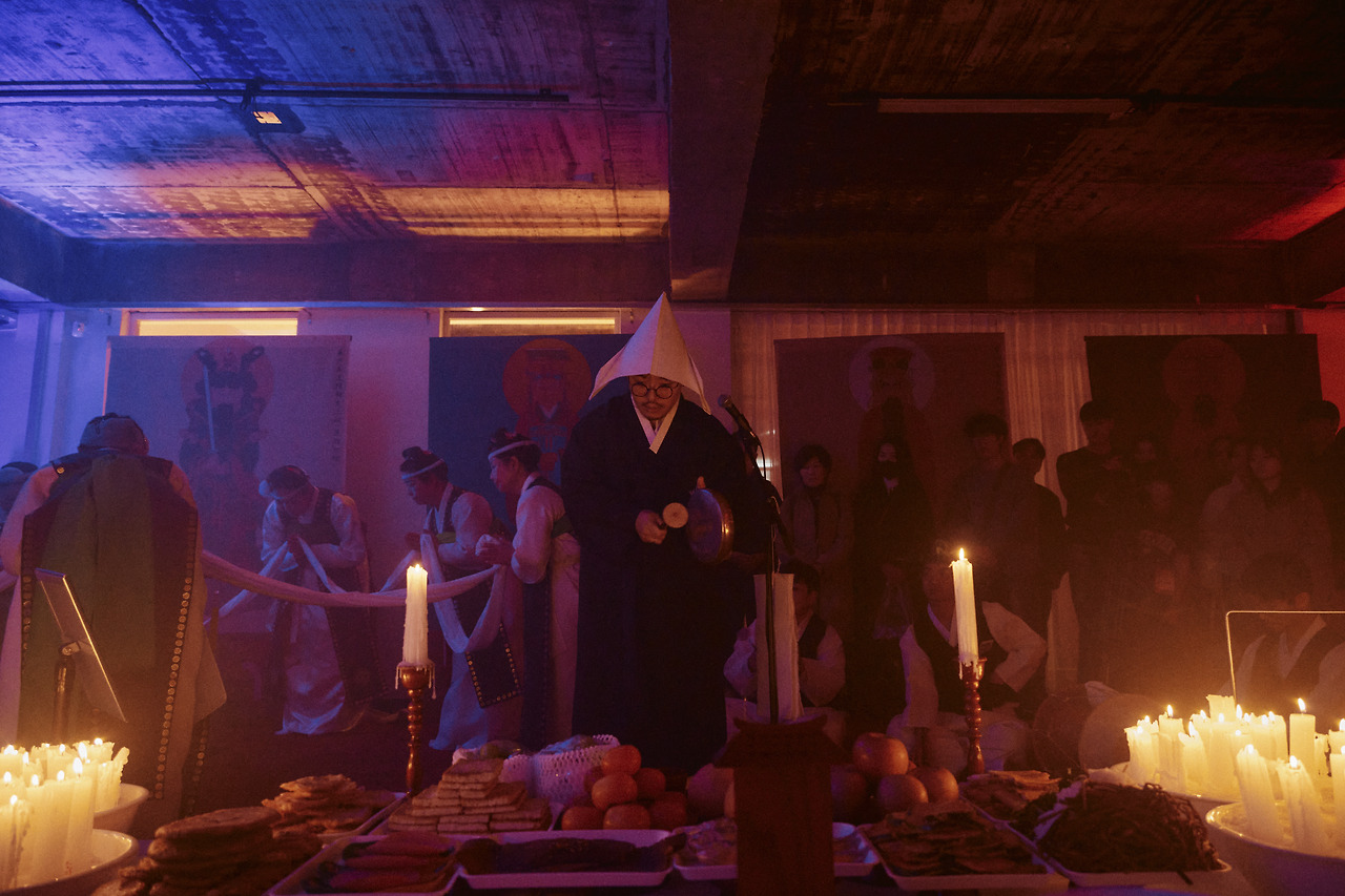 1층 무대로 내려오면 전혀 다른 리듬의 세계가 펼쳐진다. 굿은 이미 한창이며, 발 디딜 곳 없이 사람들로 가득 찬 관객석은 초반의 경직된 분위기에서 서서히 이완된다. 공연 시작 전, 방지원은 작년에 이어 올해도 연출적으로 가짜돈을 관객들에게 제공했고, 관객들은 이를 무대 위 무녀와 악사에게 꽂아주며 굿의 정서와 문법에 자연스럽게 스며든다. 이는 전통 굿에서 오래도록 이어져 온 의례적 관습이다. 흥미로운 것은, 한때 이 행위가 낯설고 이질적으로 느껴졌던 나조차 이제는 이를 너무도 자연스러운 풍경으로 받아들이고 있다는 점이다. 그는 굿의 정서를 직접 설명하거나 제시하지 않고, 반복적 행위와 관객 참여를 통해 점차 스며들도록 한다. 이러한 변화는 단순한 적응이 아니라 방지원이 자신의 작업을 통해 의도적으로 만들어낸 감응의 결과라 할 수 있다.