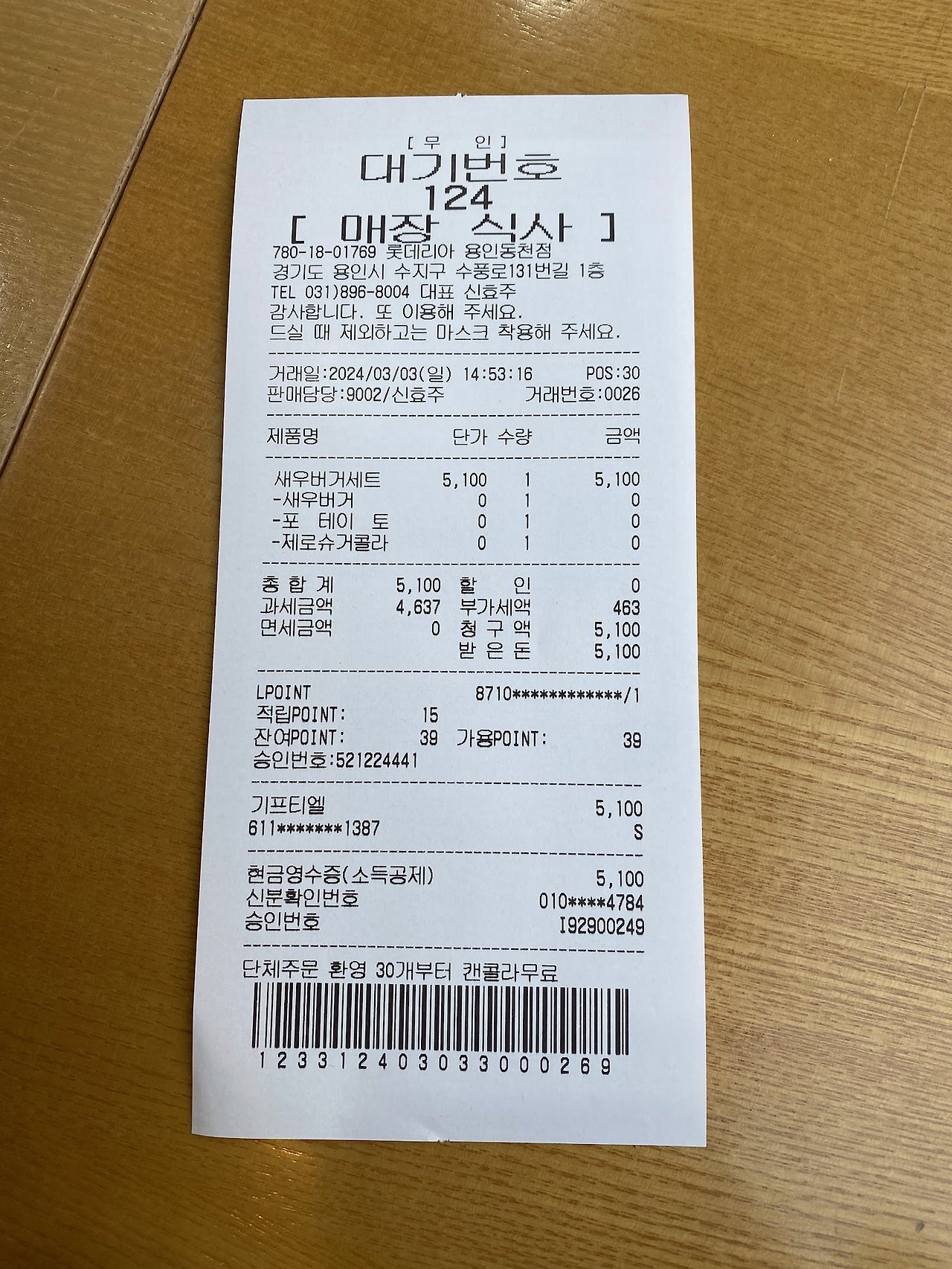 애들의 최애 메뉴는 감자튀김이다. 라지 사이즈로 각각 주문하고, 추가로 소프트 아이스크림을 주문해 줬다. 그리고 흐뭇하게 먹는 것을 바라보고 있었는데 배가 고파졌다. 그래서 나도 하나 주문해 먹기로 했다. 조금 저렴하게 먹기 위해 기프티콘을 하나 사서 주문을 했다. 그리고 아이들과 간식(?)을 먹으며 뭔가 읽을거리를 찾다 보니 '영수증'이 눈에 들어왔다. 그리고 몇 가지 의문이 들었다.