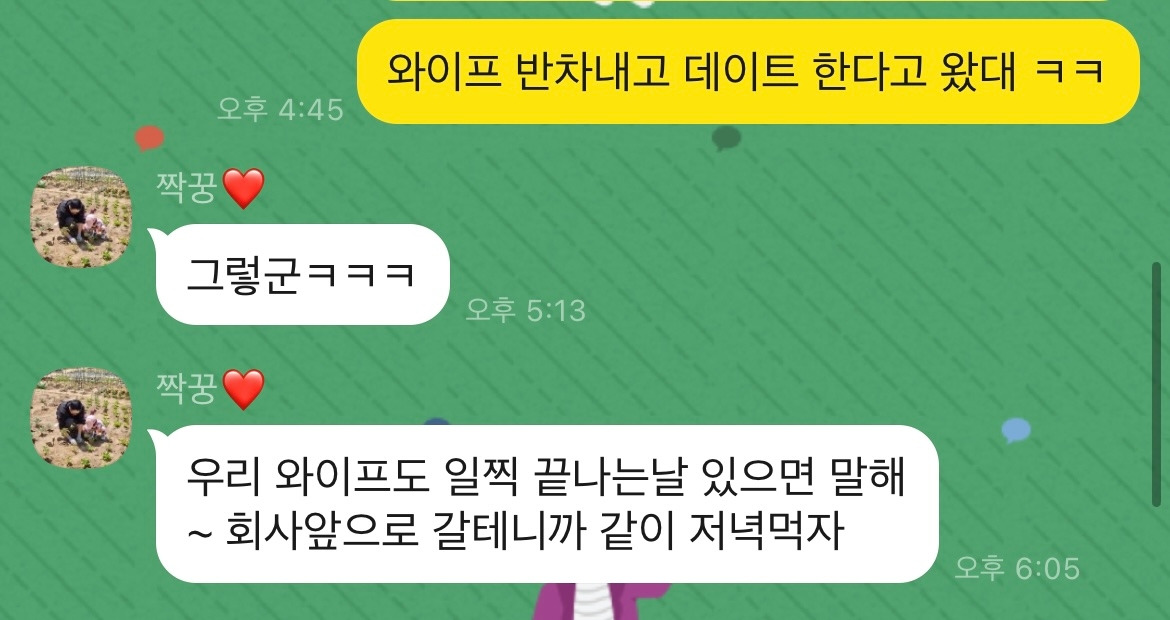 2. 회사 근처에서 우연히 친구 부부를 만났다. 직장 반차를 내고 데이트 중이었다. 남편도 아는 지인들이라 우연히 마주쳤다고 알렸다.