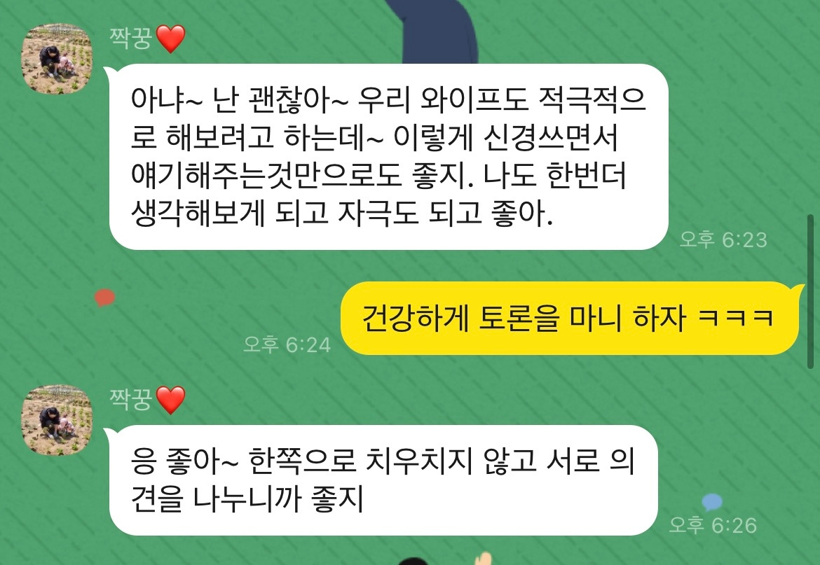 1. 재테크에 대해 이야기하던 중 의견 차이가 있었다. 나의 주장을 일방적으로 고집해 미안하다고 말했다