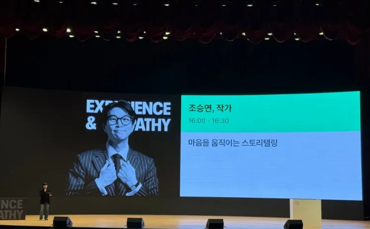둘째 날 조승연 작가, 홍승태 교수, 이진민 대표 세션을 들었는데 그중에서도 조승연 작가가 기억에 진하게남는다. 그의 유튜브 채널을 본 적은 없지만, 콘퍼런스에서 처음 마주한 그는 눈이 휘둥그레질 정도로 유려한 말솜씨를 지녔다. 30분간 진행된 그의 세션 <마음을 움직이는 스토리텔링> 몰입해서 들었다.