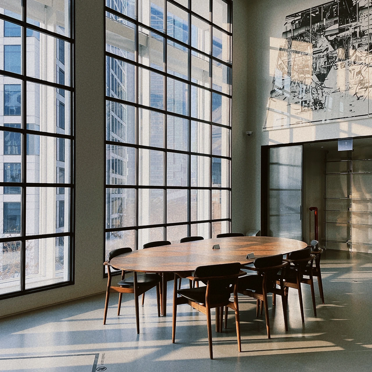 8명에서 10명이 둘러앉을 수 있는 긴 라운드 테이블, 책을 읽으며 빈 둥 거릴 수 있는 포근한 빈백과 1인용 의자, 자연을 품은 창문이 달린 오픈형 부엌, 그리고 침대와 은은한 사이드 조명만이 놓인 미니멀한 침실.