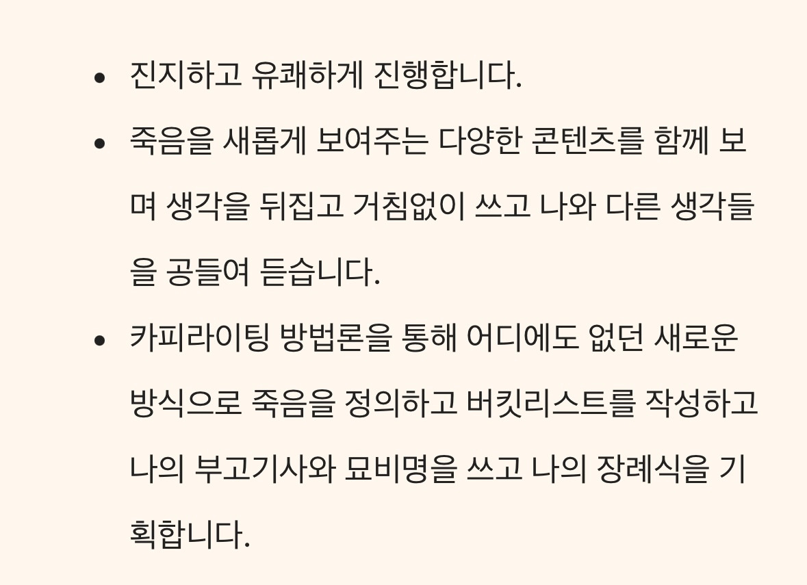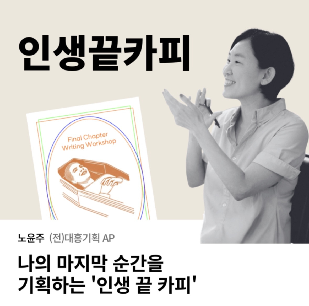 생각을 덧대니 윤주님(www.instagram.com/nonan.roh) ‘인생 끝카피’ 세션이 궁금하다. (진작 마감이다) 나의 죽음을 선명하게 하는 글쓰기, 진지하고 유쾌하게 진행할예정이라는데 죽음과 삶을 새롭게 바라보며 나를 정의해 본다는데, 흥미롭다.
