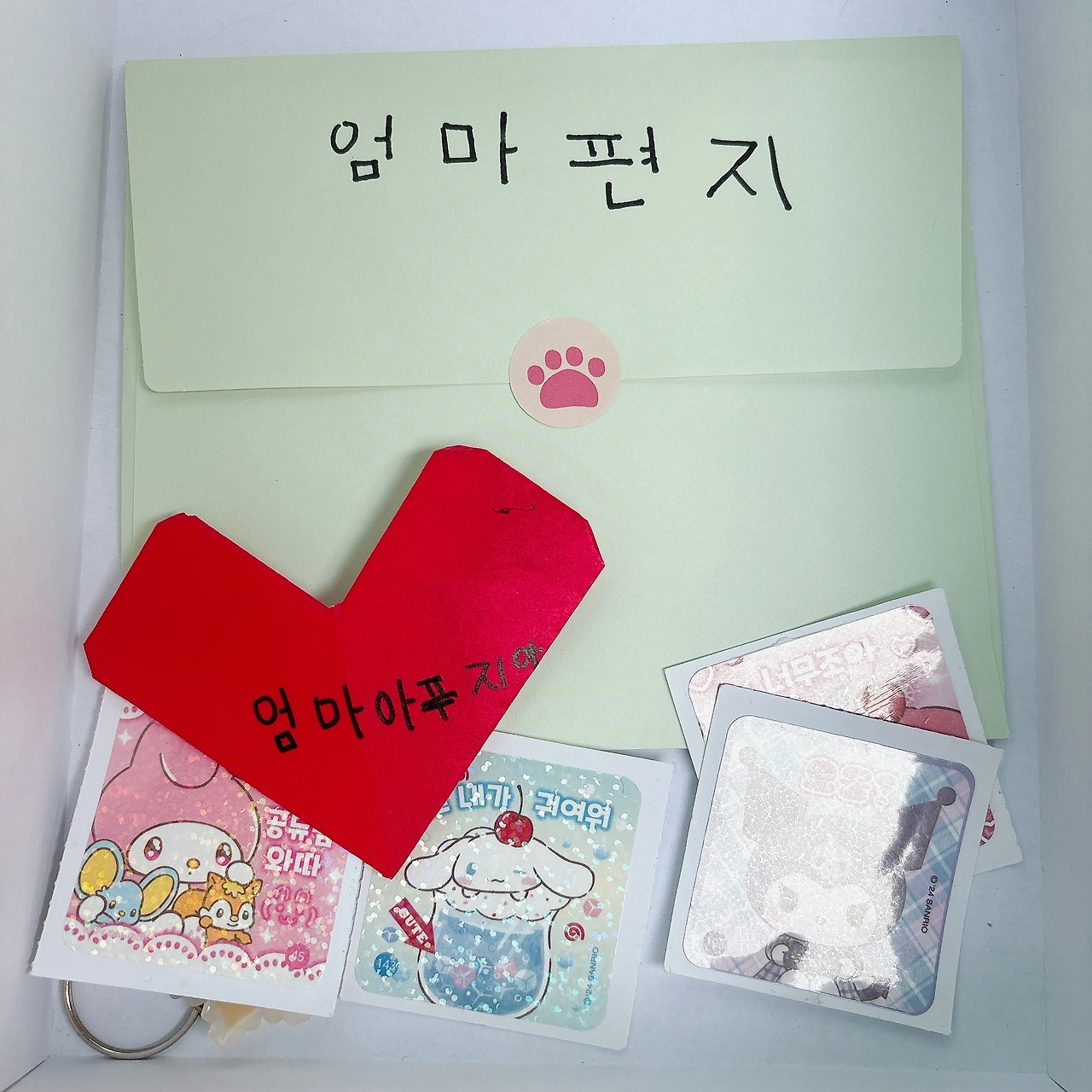 다행히 둘째 주는 시부모님께서 봐주신다고 하여 강릉으로 보냈다. 세상에 아이 없는 일주일이라니. 아이의 부재가 나의 여유로 이어질 줄 알았건만 오히려 운동도못 가고 업무로 숨 가쁜 한 주를 보냈다. 설상가상 감기몸살로 체력까지 바닥났다. 강릉으로 떠나기 전날도 몸살 기운으로 기침을 해댔는데 아이가 선물이라며 핑크색 박스를 내밀었다. 오버사이즈의 박스 안에는 카드와색종이로 접은 하트가 있었다.