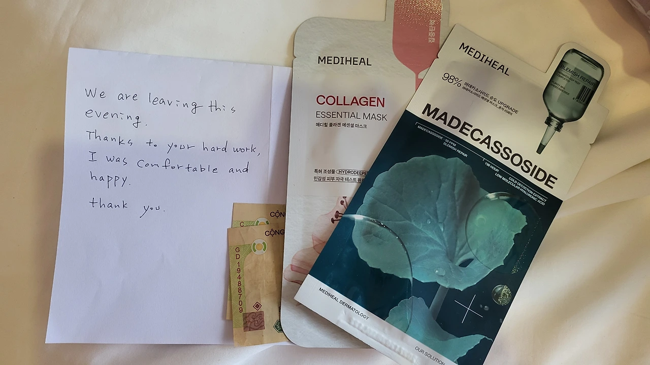 방으로 돌아와 짐을 싸며, 그간 아들과 내 방을 청소해 준 분들께도 약간의 돈을 남겼다. 5일을 머무는 동안 그들과 자주 복도에서 마주쳤다. 그리고 일부러 사용하지 않고 둔 마스크팩도 침대 위에 두었다. 외국에서 한국 마스크팩의 인기가 높다는 얘기를 들은 적이 있었다. 마지막으로 감사한 마음을 편지에 담았다.