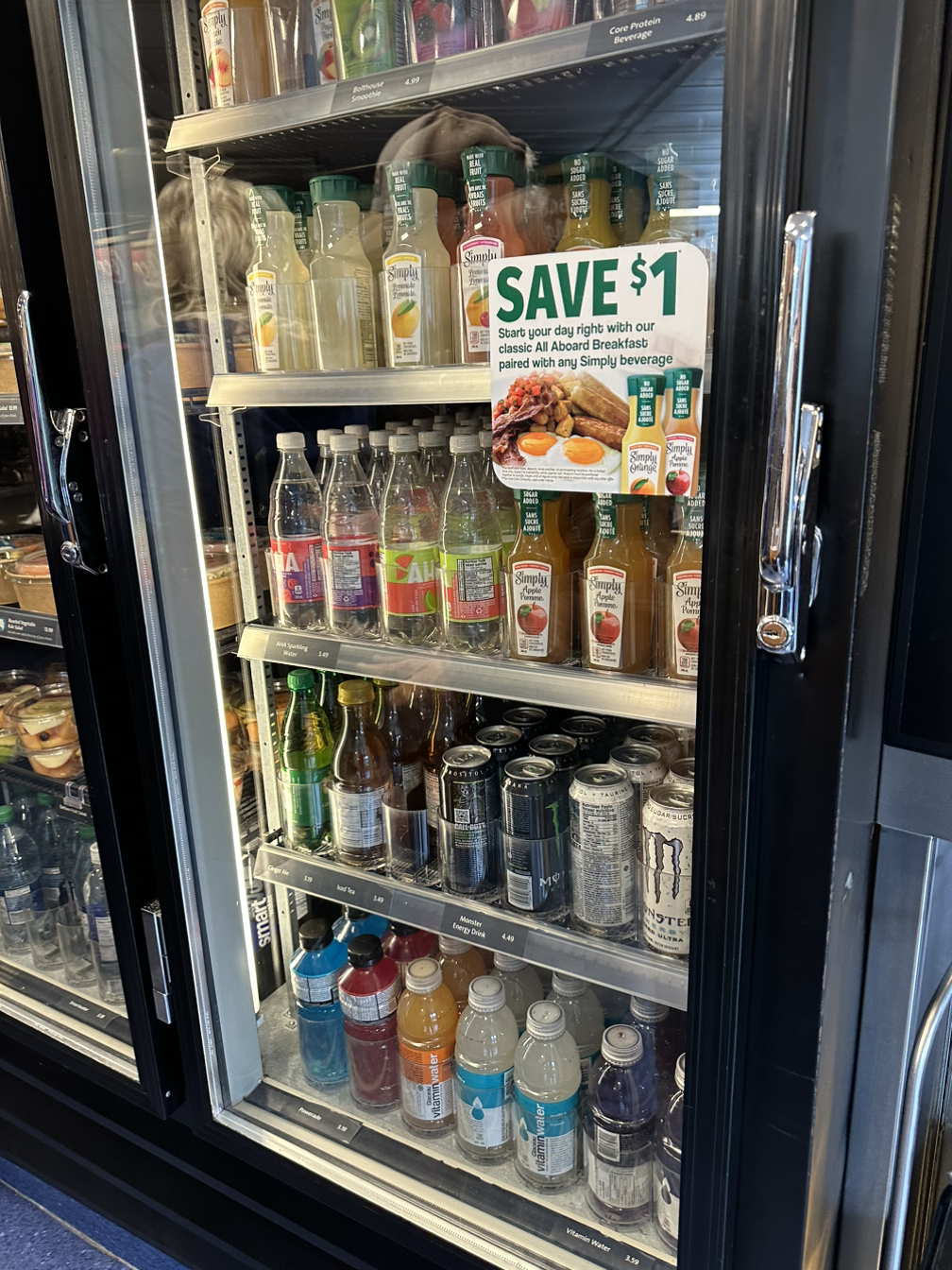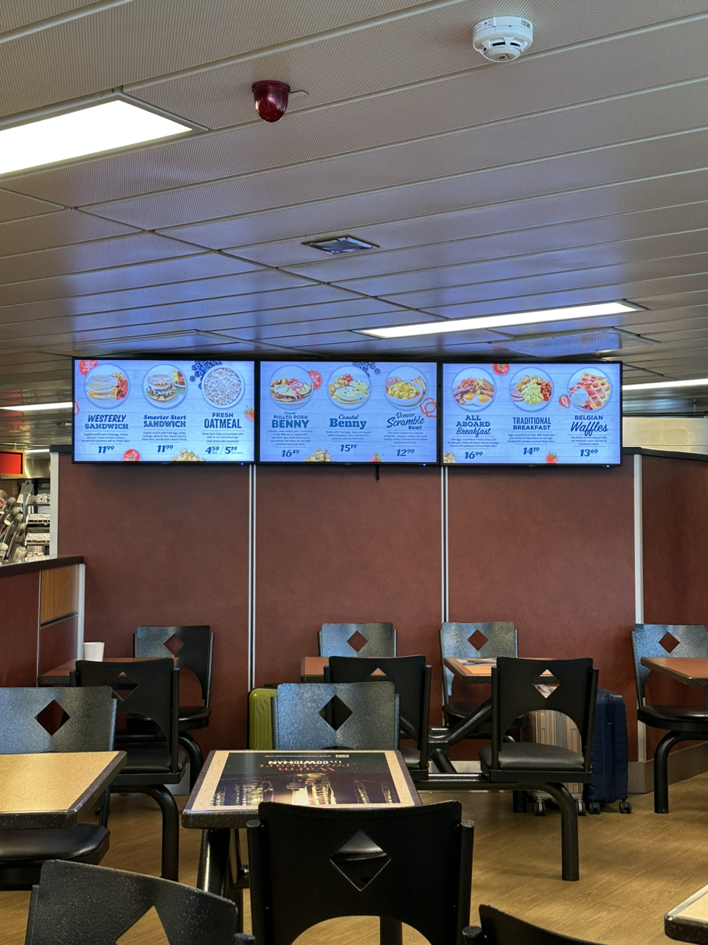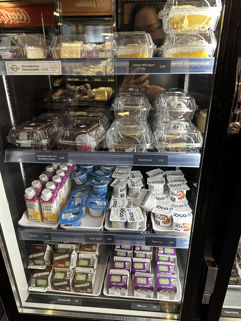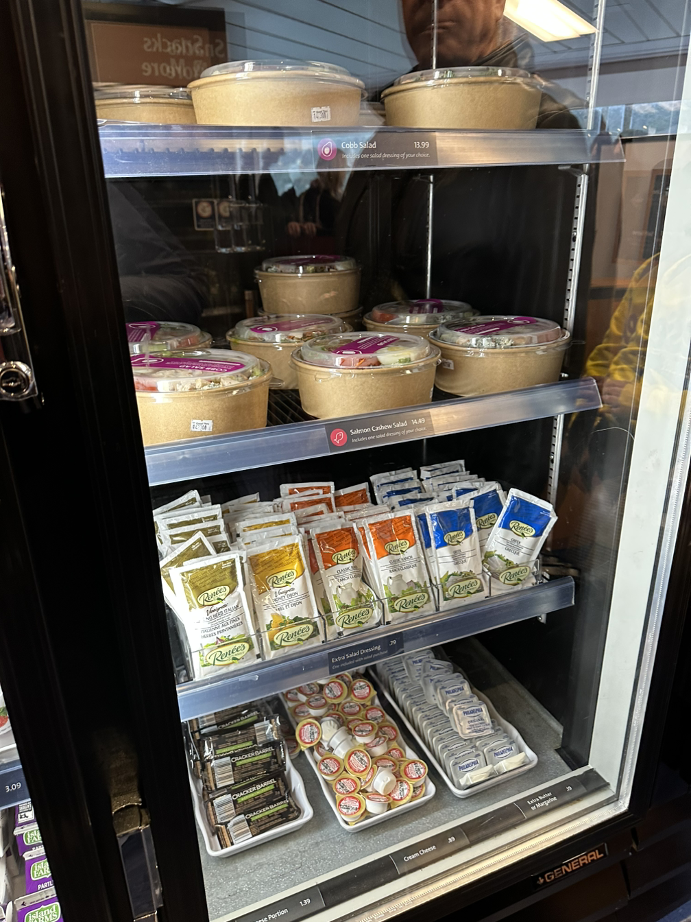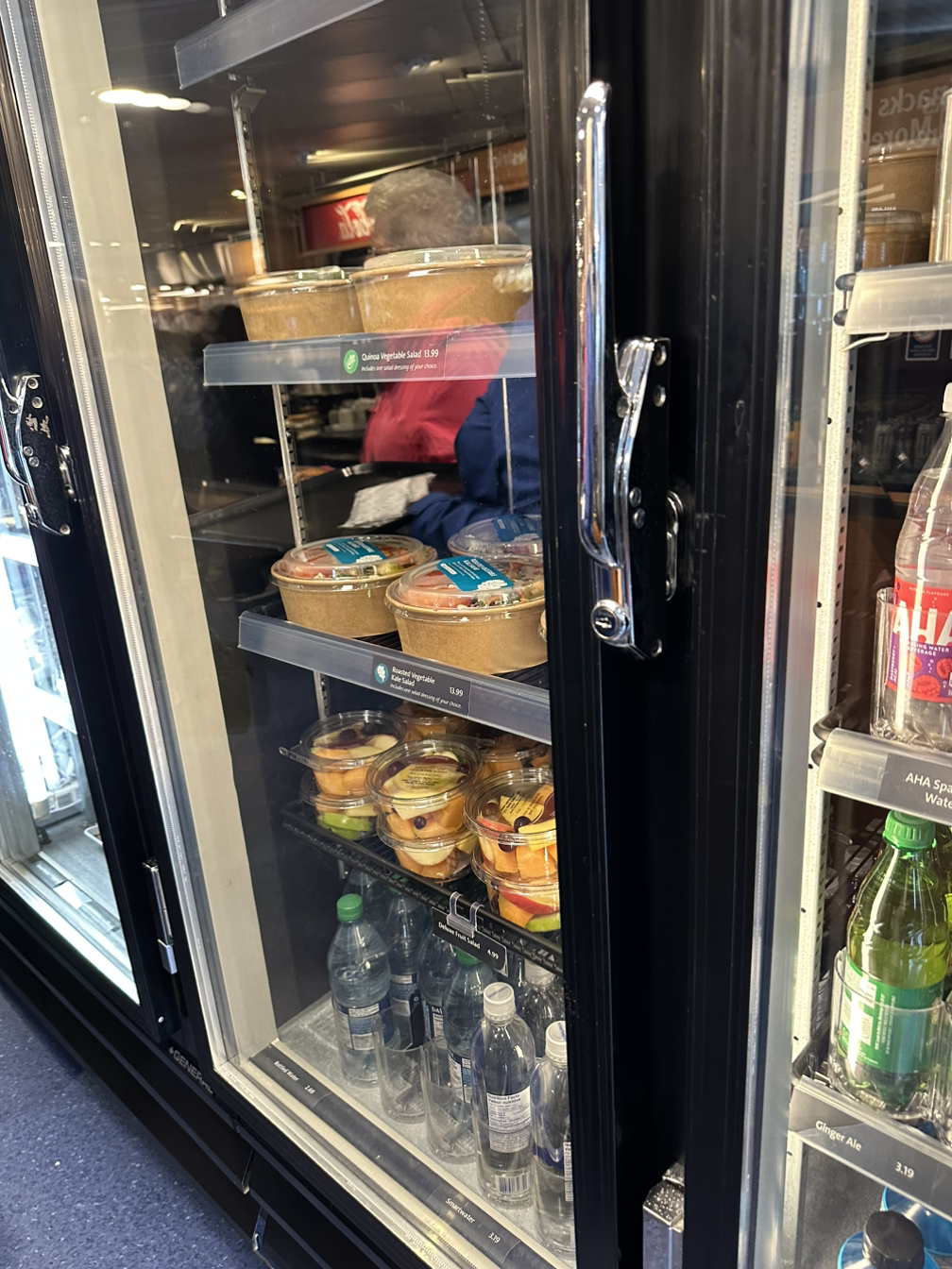 페리에서 먹는 즐거움을 누리고자, 탑승하자마자 식당 줄에 줄을 섰다. 앞뒤 모두 할머니 할아버지들이 많이 계셨다. 성인인 딸과 아버지가 메뉴를 뭘 먹을지 대화가 끊이지 않는다. 우리 한국 사람들도 이렇게 메뉴선택을 위한 대화를 이리도 신중하게 할까 싶다. 대화의 요지는 각자의 식사와 음료 메뉴선택과 짐이 있으니 딸이 먼저 테이블 자리를 맡고 있겠다는 매우 기본적인 내용들… 역시 리스닝은… 현실 대화에서는 영어를 듣다 보면 중요한 말은 많이 없단 걸 또 느낀다. 메뉴는 스크린에 뜨는 식사메뉴 외에도 냉장고에 준비된 다른 메뉴들도 있다. 줄을 서서 이동하며 접시에 담고, 조리되는 메뉴가 필요 없는 사람은 바로 계산대로 가서 계산하면 된다.