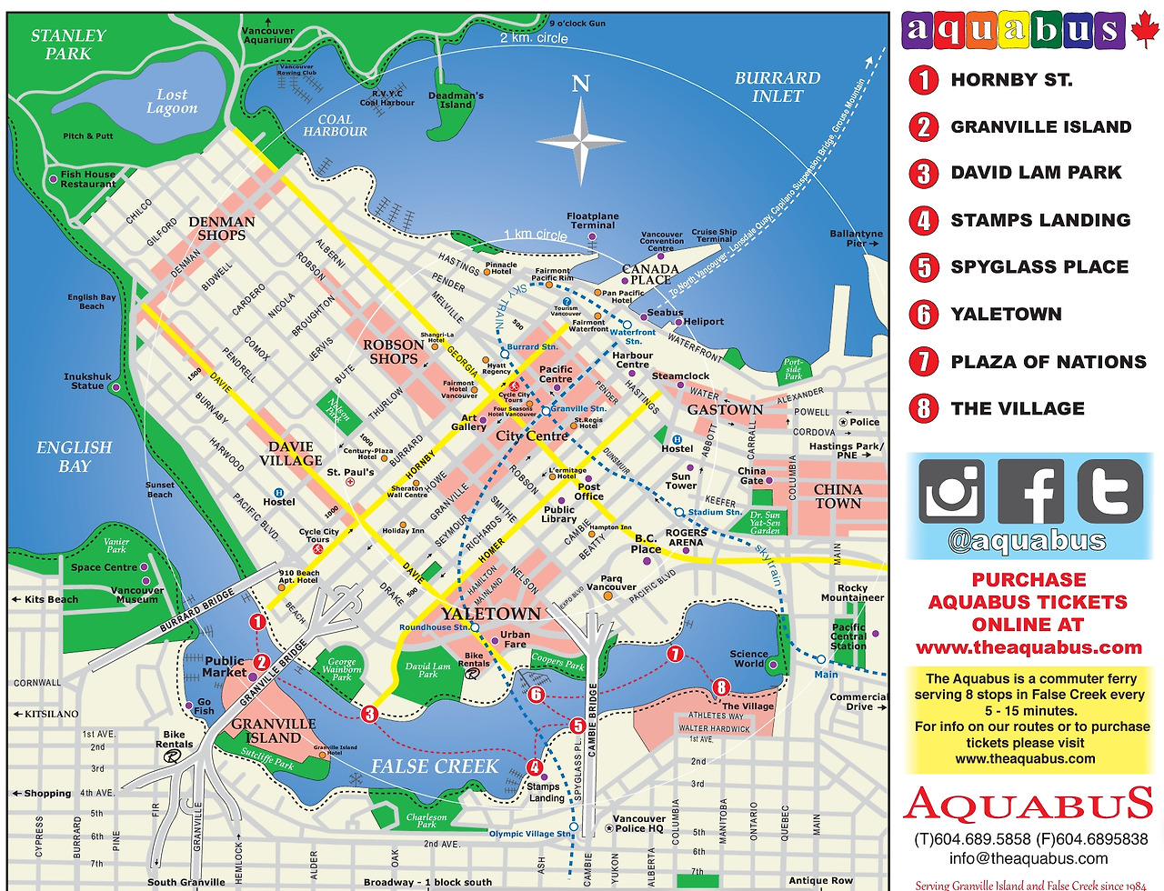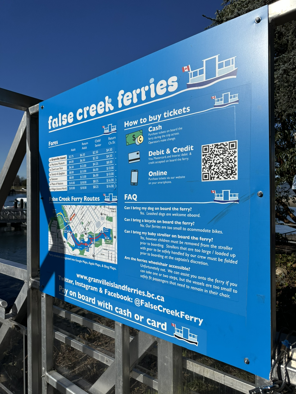 이 교통편은 그랜빌 아일랜드와 다운타운을 연결해 주는 편리한 교통수단이다. 지도(https://theaquabus.com/wp-content/uploads/2018/08/Aquabus-Docks-Map-Front-2018.pdf) 를 참고해 보면, 여행루트를 짜기 좋다. 제일 짧은 경로 2번 에서 1번으로 가는 페리표 (Granville Island to Hornby St.)를 끊었다. 그랜빌 아일랜드에서 예일타운을 가기도 매우 편리한 교통수단이지만, 요금이 좀 비싸서, 하루에 몰아 타려면 일일권을 끊어도 좋다. 한 달 패스도 구매할 수 있다.