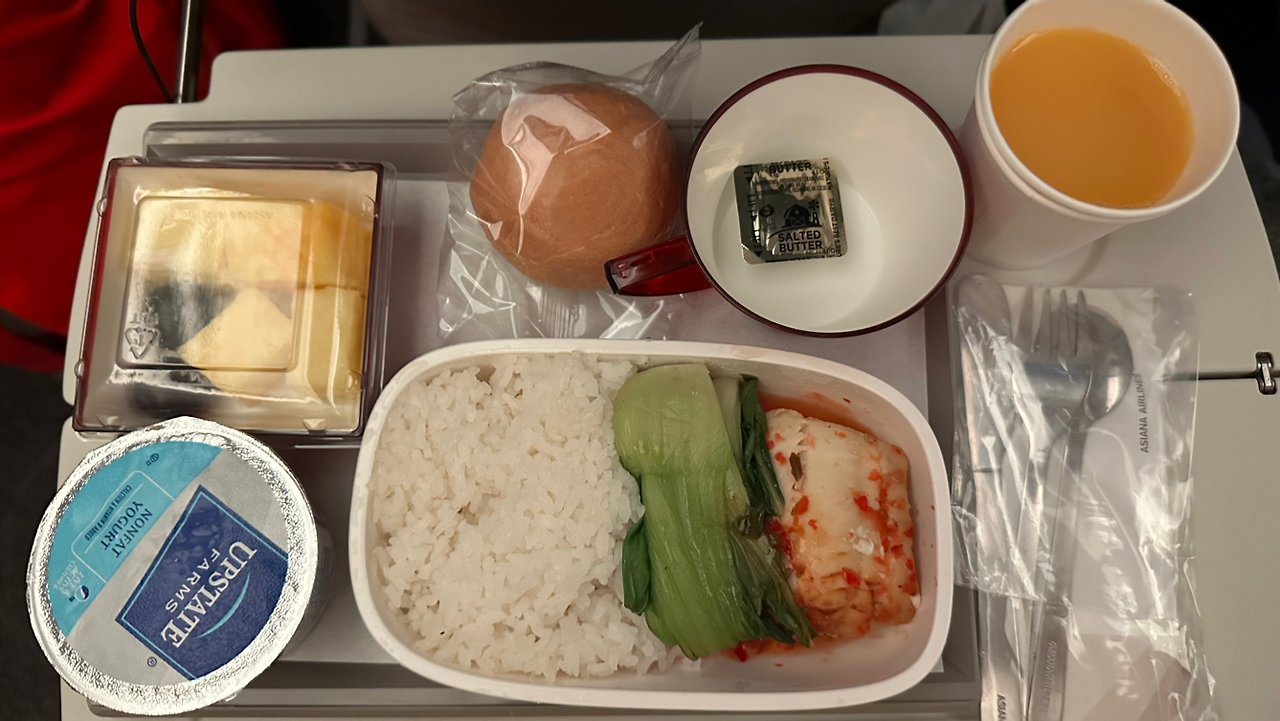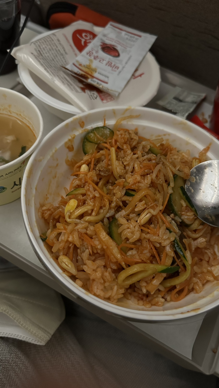 추가 간식도 더 받아서 먹고! 한식 한 번 더! 이건 생선과 밥! 난 기내식이 좋다! 꿀맛이다! 젊을 땐 양이 많이 부족했는데, 이젠 양도 딱 좋다! 이제 한 숨자면 내리면 된다!