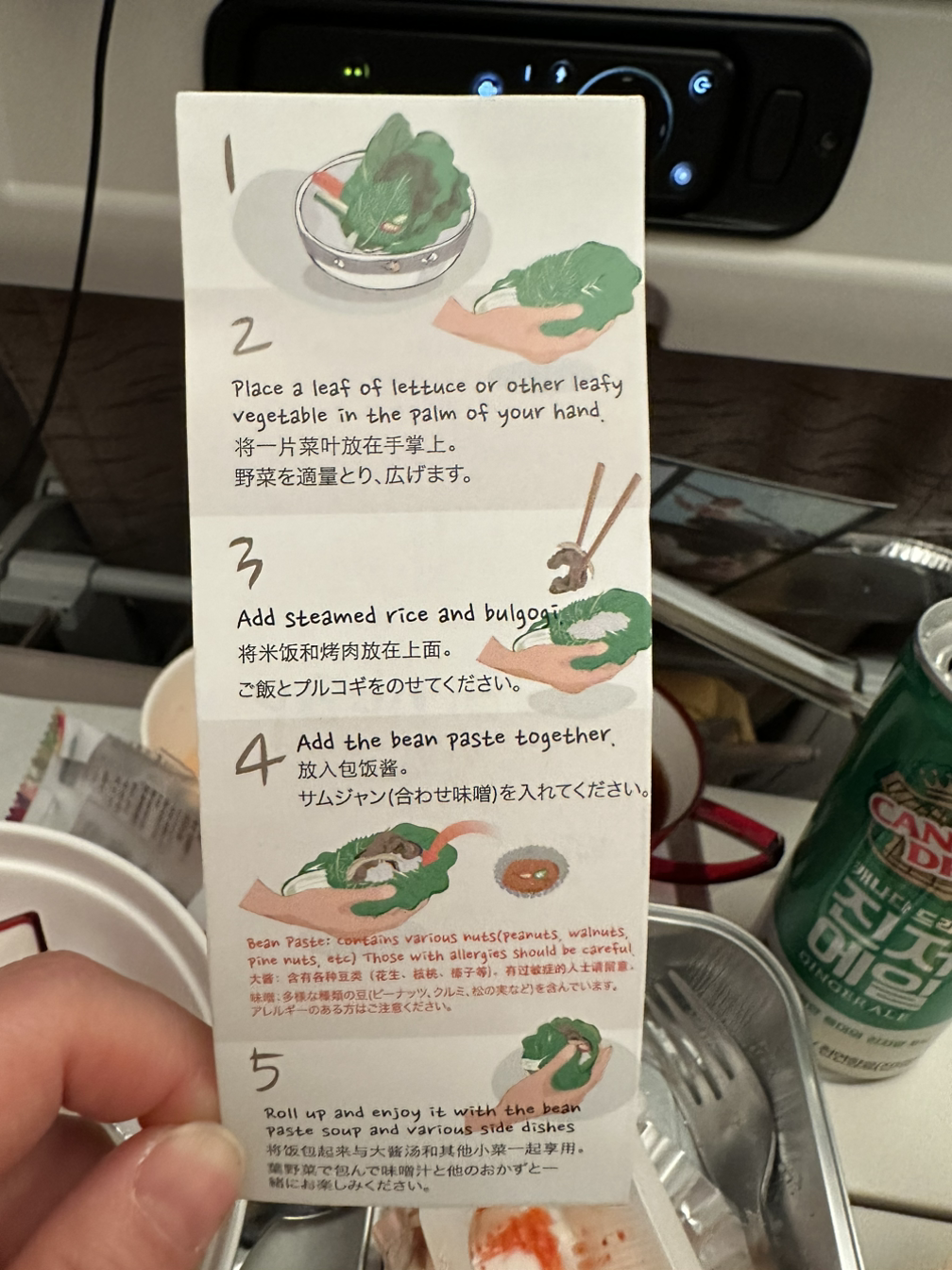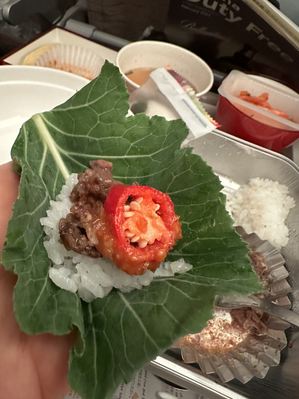 정시에 출발하는 항공편 OZ 272편! 별 기대 없이 오른 이 항공편에서 난 인생 기내식을 만나게 된다. 그것은 바로 쌈밥! 한국인에겐 너무도 흔한 쌈밥! 기내에서 먹는 쌈밥이 이렇게 맛있을 거라곤 상상도 못 했다. 먹는데 정신없어 건진 사진은 몇 안된다. 나중에 안 사실이지만, 대한항공 비빔밥을 제치고 기내식 랭킹 #1에 오른 메뉴란다. 대한항공만 타는 아는 동생은 이걸 먹어보고자 아시아나를 한 번은 타볼까 고민 중이라고.