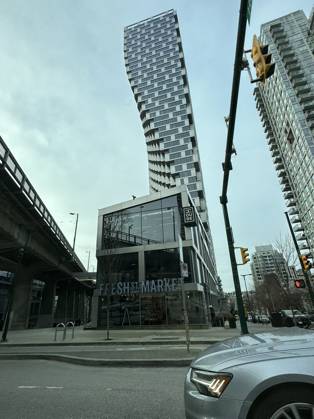 밴쿠버 다운타운은 차로는 끝에서 끝이 십 분도 안 걸린다. 나름 동쪽 끝자락에 있는 T&T를 들러서 다시 서쪽으로 들어와 아까 말한 그 건물을 보러 왔다. 이제 곧 완공식/오픈식을 할 것 같은 분위기였다. Kengo Kuma라는 건축 수업에서 여러 번 들어봤던 건축가이다. 건물이름은 Alberni! 주소지 거리이름을 그대로 따다 건물이름으로. 간단한 거 정말 좋아하는 캐나다! 밴쿠버 하우스만큼이나 단순한 이름이다.