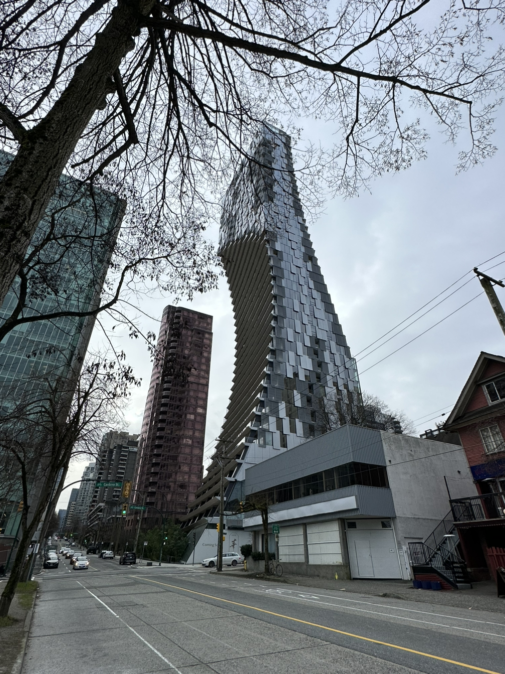 커피를 마시고, 커피콩도 얻고, 빵도 또 먹고!!! 먹을 복 터진 오전!!! 그렇게 다운타운을 빠져나오는데, 나의 밴쿠버 최애 건물로 등극한 BIG의 밴쿠버하우스! 이 각도에서 찰칵, 빌딩 바로 밑에서도 한 장 더 찍었다. 빌딩아래에서 접사도 하나 더!!!