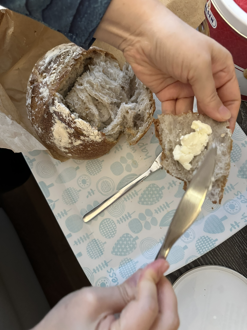 집 앞 빵집 갓 구운 빵 도전은 7:30이 넘어 일어난 나 때문에 친구 신랑이 테이크아웃을 해왔다. 사진에서는 온도가 전해지지 않아 아쉽다. 따뜻한 빵을 찢어서 버터를 발라 먹는데, 정말 맛있다. 갓 구운 너 이런 거였구나!!! 겉바속촉의 원조는 이것이었을까? 거기다 담백함은 덤!!! 돌아와서도 생각날 맛! 가게는 주소로 세이브를 안 해놨으니 구글링으로 다시 찾아야 할 것 같다.