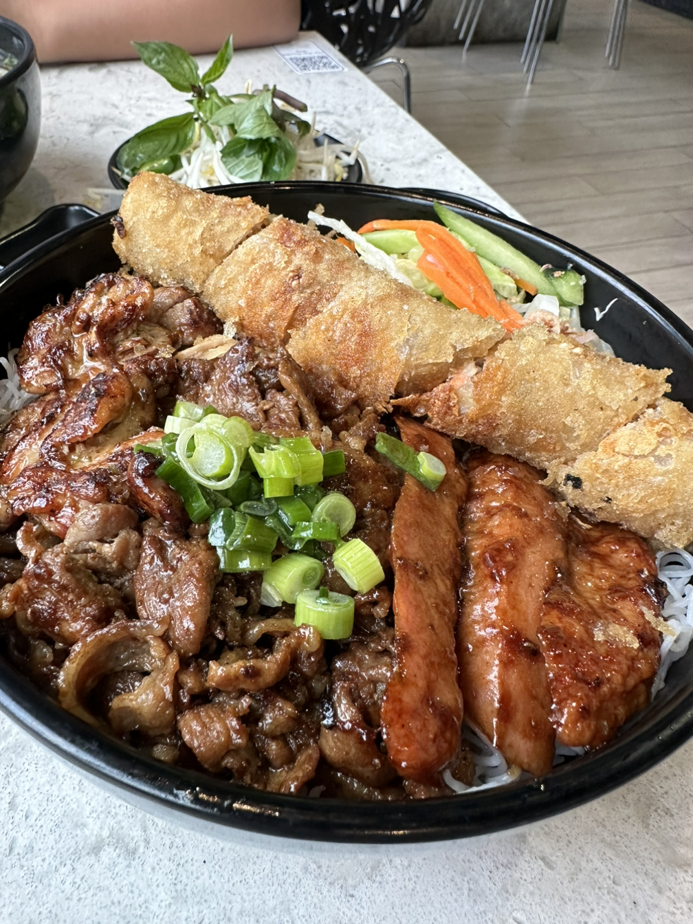 이렇게 휘리릭 다운타운 관광을 마치고 향한 곳은 제자 J와 같이 점심을 먹을 베트남식당. 위치는 버나비 쪽 브렌트우드로 이동해 왔다. 버나비는 차로 20 정도 거리에 있다. 돼지, 소, 닭고기가 다 올라가 있고, 저 큰 스프링롤 튀김도 있는 놀라운 양의 음식! Vermicelli! 우리나라에선 비슷한 메뉴가 있는지 모르겠다. 결론은 양이 너무 많아서 반도 못 먹고 싸왔다. ㅎㅎㅎ 고기 좋아하는 나 같은 사람은 꼭 먹어야 하는 메뉴 같다!