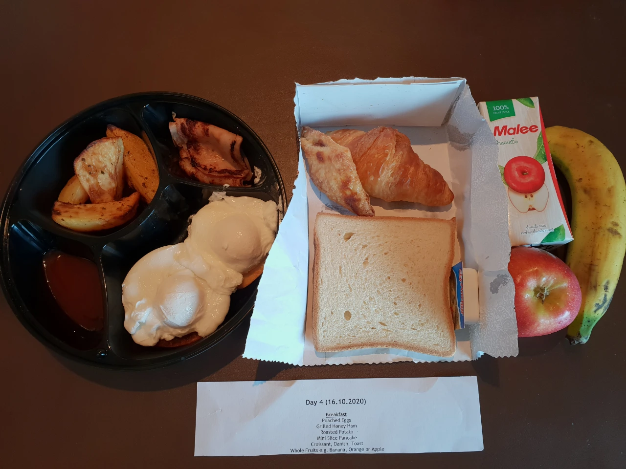 Poached Eggs Grilled Honey Ham Roasted Potato Mini Slice Pancake Croissant, Danish, Toast Whole Fruits : Banana, Apple