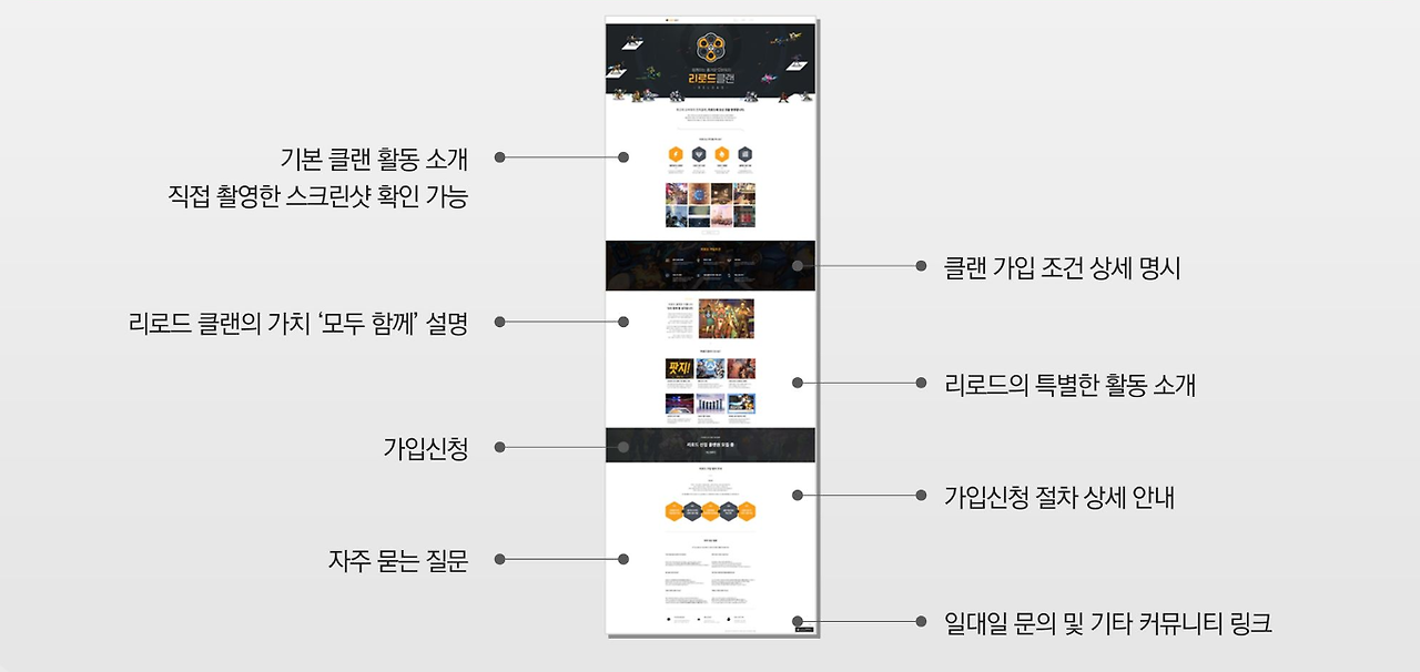 다행히도 멋진 이미지를 만들기 위한 포토샵은 어느정도 경험이 있던 터라 꽤 느낌있는 이미지를 만들었다. 클랜 소개, 가입 조건 등 기본적인 내용을 비롯해 미래의 클랜 콘텐츠 구상을 담았다.