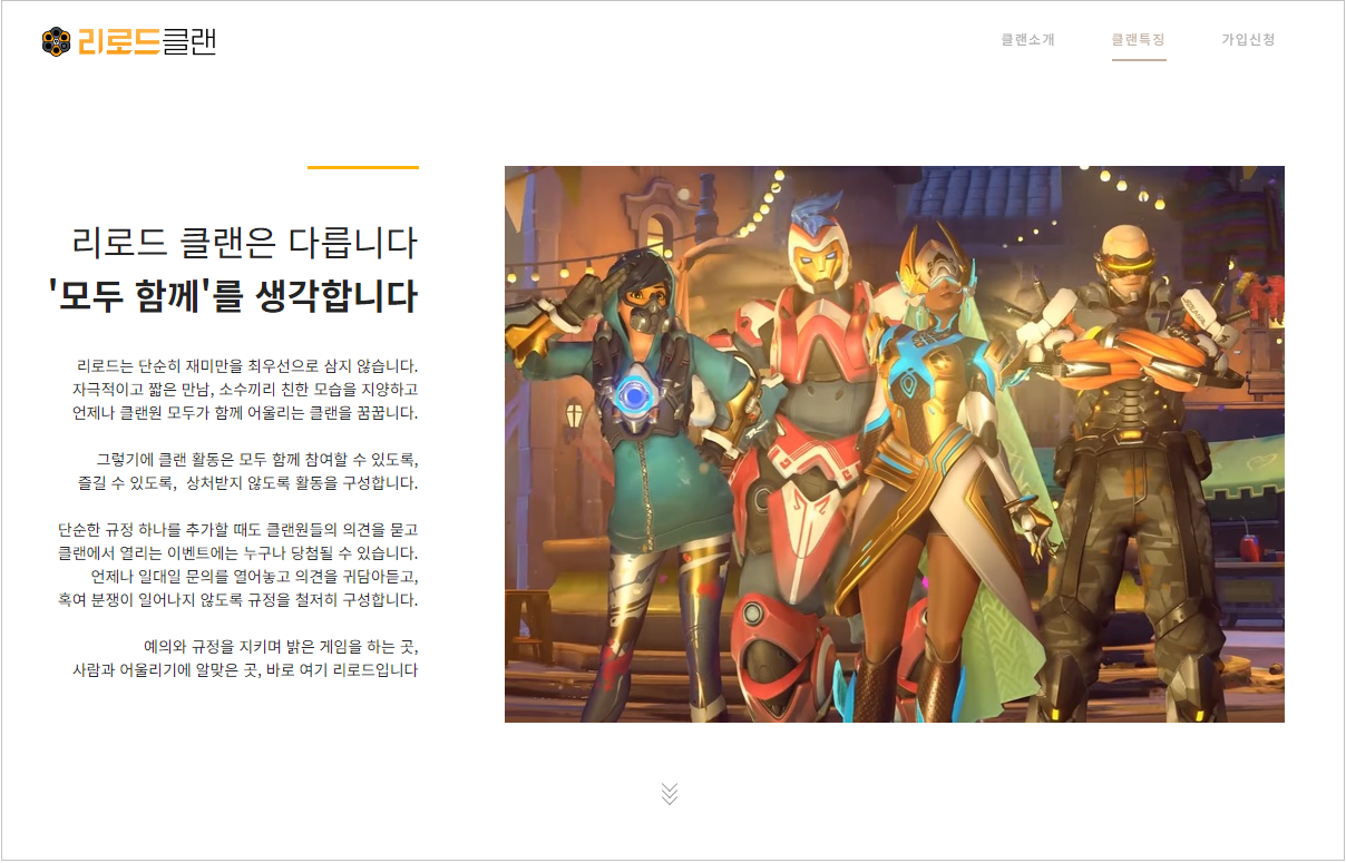 홈페이지는 단순 이미지보다 더 많은 이야기를 담기 적합하고, 정말 좋은 클랜이라는 자신감을 내비칠 수 있는 창구다. 이미 이미지도 있던 터라 뚝딱뚝딱 2,3일 만에 만들었다.