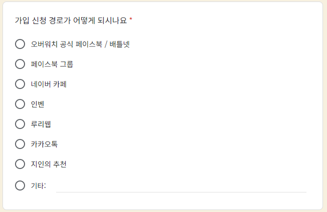 채널이 많았던 만큼 가입신청서에 필수 질문으로 가입 경로를 수집했다. 다들 네이버카페 가입할 때 이런 걸 적은 기억이 있을 거다. 그 당시에는 왜 필요한지 몰랐으나 홍보를 직접 하는 순간에는 너무도 소중한 데이터였다.