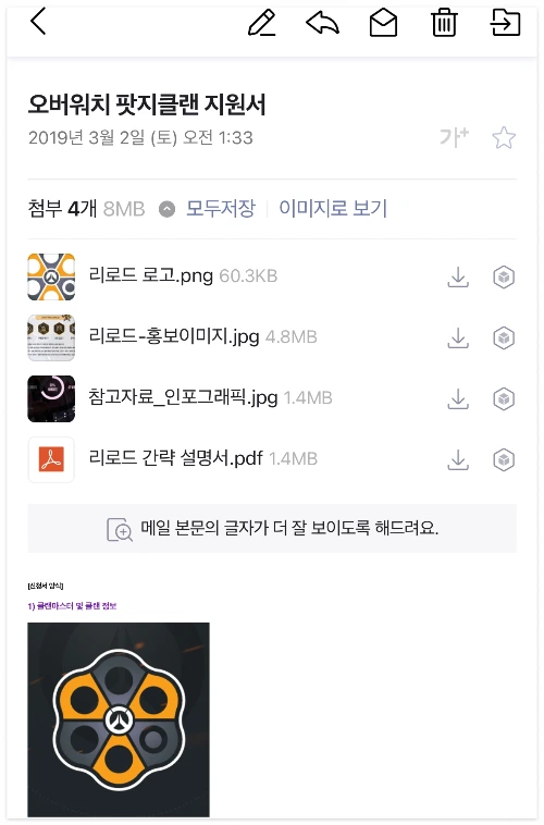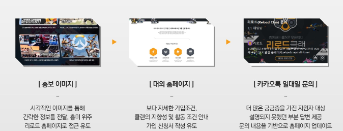 본문에는 양식에 맞춘 내용을 가득가득 채우고, 활동했던 게임 공략글 작성 사례들, 오버워치에 대한 애정, 클랜 운영 방식 등을 상세히, 거기에 간단한 리로드 설명서를 만들어 첨부해 발송했다.