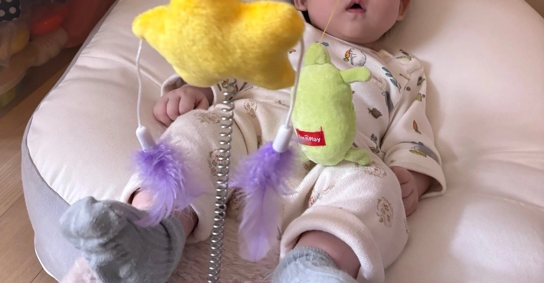 그러나 아기는 금세 이 장난감에 적응을 하더니 어느 순간부터는 큰 흥미를 보이지 않았다. 아기는 아직 척추가 발달하지 않아 몸통을 움직일 수 없는 상태였는데, 그럼에도 팔과 다리를 움직일 수 있었다. 그런데 이 대형 모빌은 아기에게 움직일 여지를 주지 않는다. 그저 빙글빙글. 바라보기만 할 뿐이다. 그러하니, 아무리 음악이 다양하게 나와도 아기 입장에서 큰 재미를 느끼지 못했을 수 있겠다. 이 즈음에 아기가 오히려 흥미를 보였던 놀이는 바나나친구를 손으로 치는 것, 그리고 다이소에서 사 온 강아지용 장난감(별 모양의 인형 아래로 스프링이 달려있어서 톡 건드리면 반동으로 움직이는 단순한 용품)이었다. 역류방지쿠션 위에 눕혀놓고 아기 발 쪽에 두꺼운 책들을 쌓아 올린 다음 이 스프링장난감을 발 쪽에 대어주면 발을 막 움직이면서 팡팡 밀어냈다.