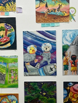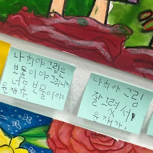 그리고 걱정이 무색했음을 금방 깨달았다. 사랑스럽고 독특한 작품들이 갤러리 벽을 장식하고 있었다. 작품 근처에 포스트잇을 붙여 작가를 응원하는 말을 남길 수도 있었는데, 작품도 물론 좋았지만 그 코멘트를 보는 재미도 쏠쏠했다. 특히 꼬불꼬불 쓰인 어린이들의 서로를 향한 응원, 작가인 아이들을 격려하는 부모들의 소망 어린 글씨들을 보며 조금 눈물을 흘릴 뻔했다. 나도, 어린이는 아니지만, 어린이 작가들처럼 부모님들의 근거 없고 조건 없는 사랑과 응원을 받고 있어서일까. 포스트잇에 담긴 익숙하고 순수한 마음들이 하나하나 소중하게 느껴졌다.