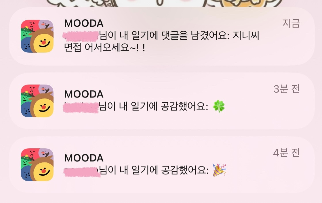 MOODA의 가장 큰 장점 중 두 번째는, 유저 간의 소통 기능이다. 우선 서로 일기를 읽어 주는 느낌을 제공해 더 부지런하게 쓸 수 있게 해 준다. 일기장에는 공개 범위 설정 여부에 따라 댓글이나 공감을 달 수 있어 따수운 소통이 가능하다...... 게다가 왠지 이 앱을 굳이 사용하는 사람은 악플따위 달지 않을 것 같다는 편견(!)이 있다.
