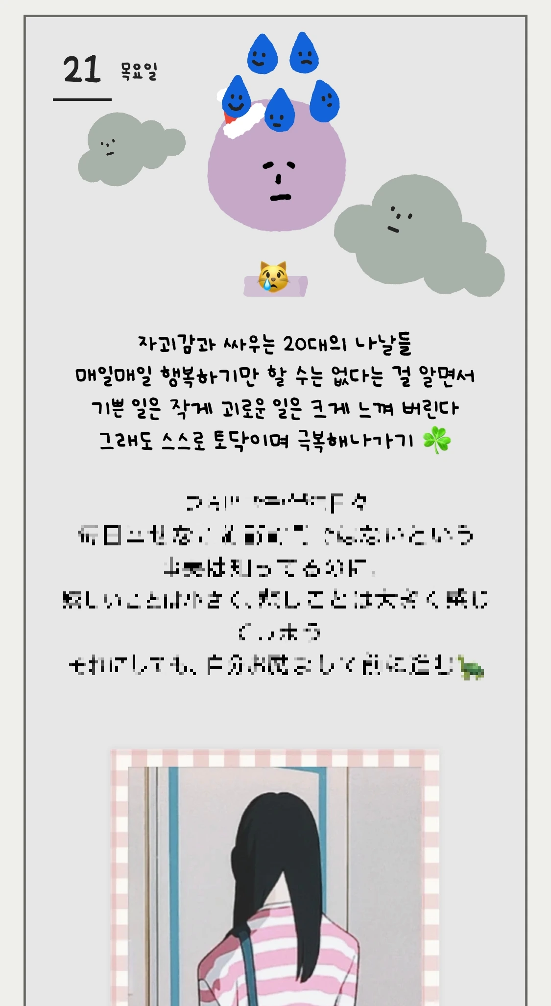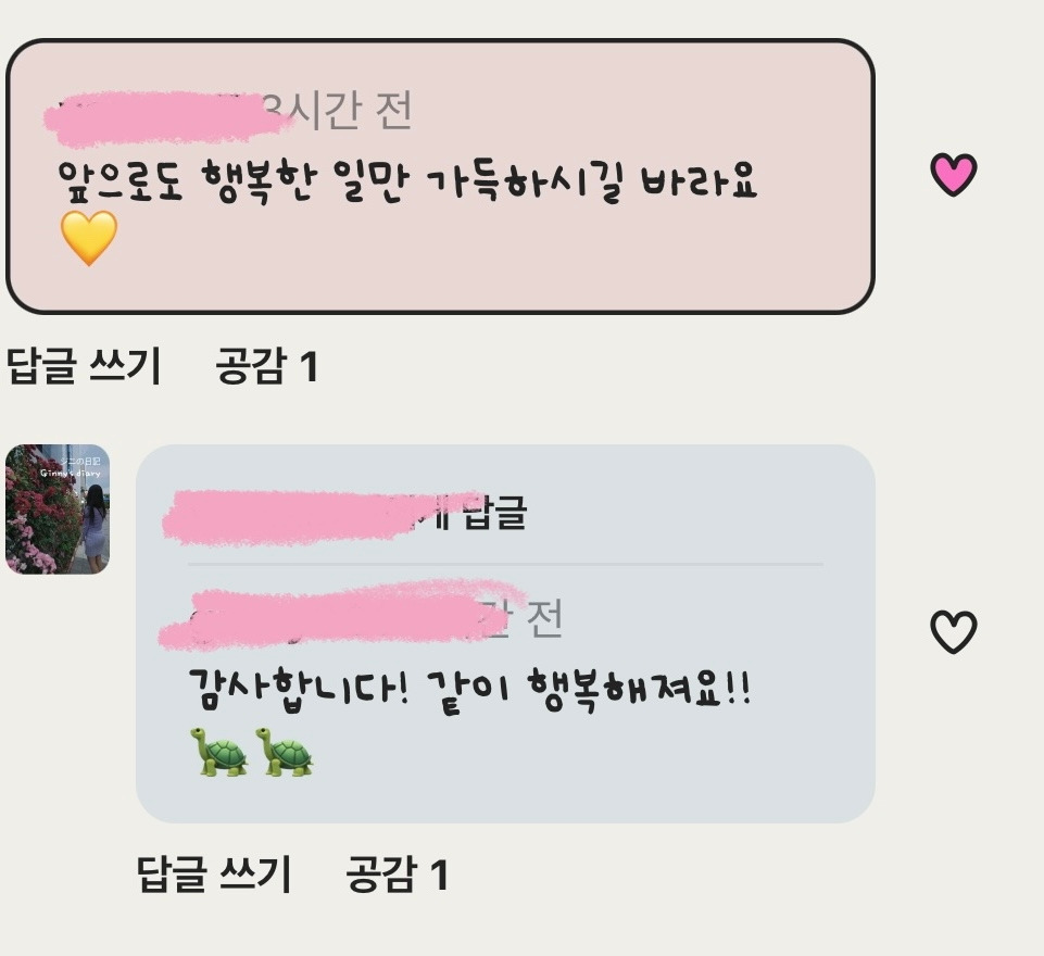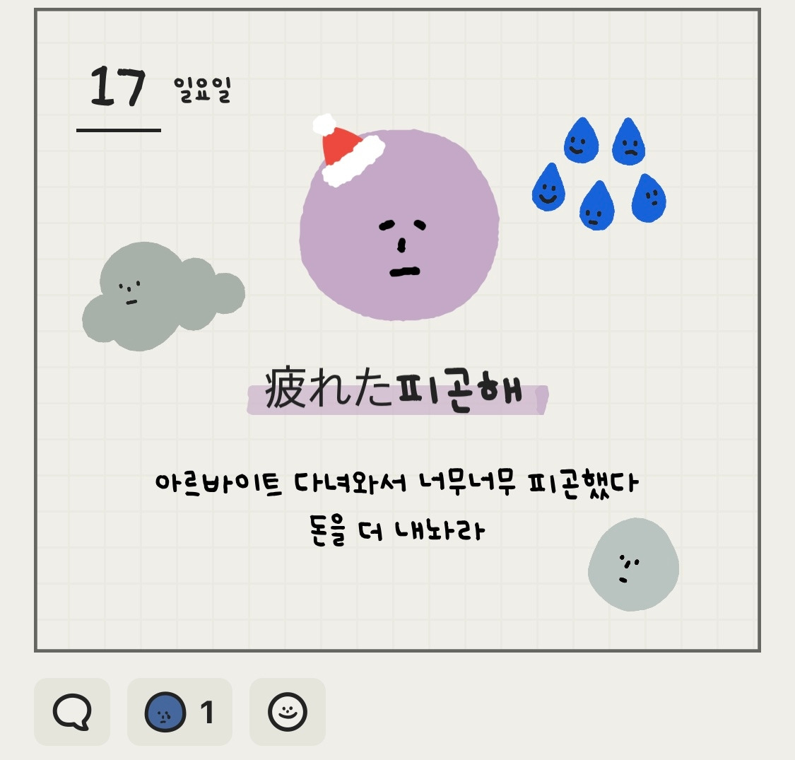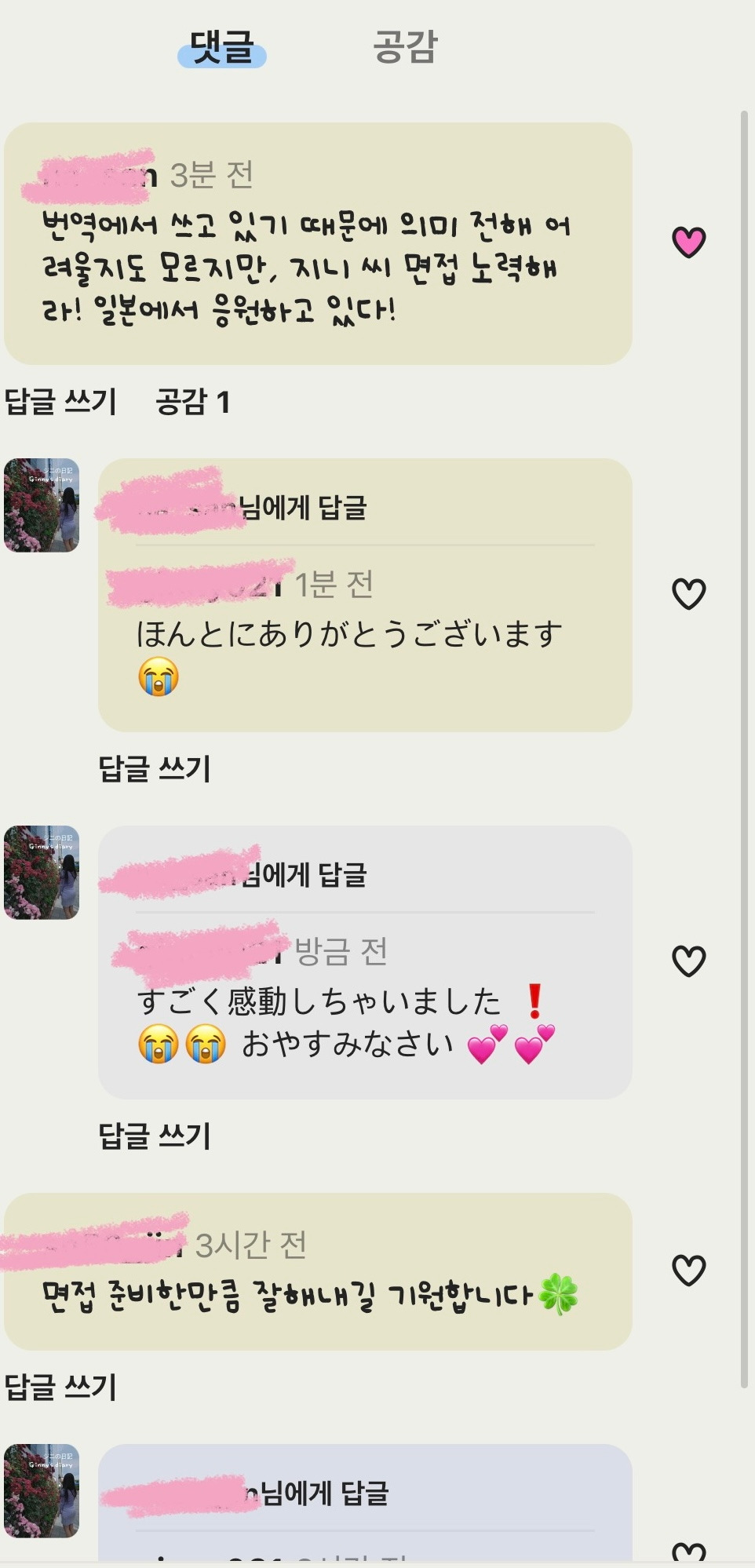 나는 일기장 기능에, 일본어 공부 중이라 한국어+일본어 두 가지로 일기를 쓰는데 일본어를 사용하는 유저들 탭에 들어가서 일본인들 일기에 반응하고 다녔더니 나에게도 댓글과 공감 이모티콘이 달렸다! 이 앱으로 또 힐링하는 기분.