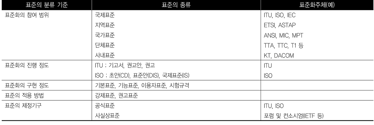 대표적인 표준인 정보통신 분야의 표준은 참여범위, 진행 정도, 적용방법 및 제정 기구에 따라 아래와 같이 분류된다.