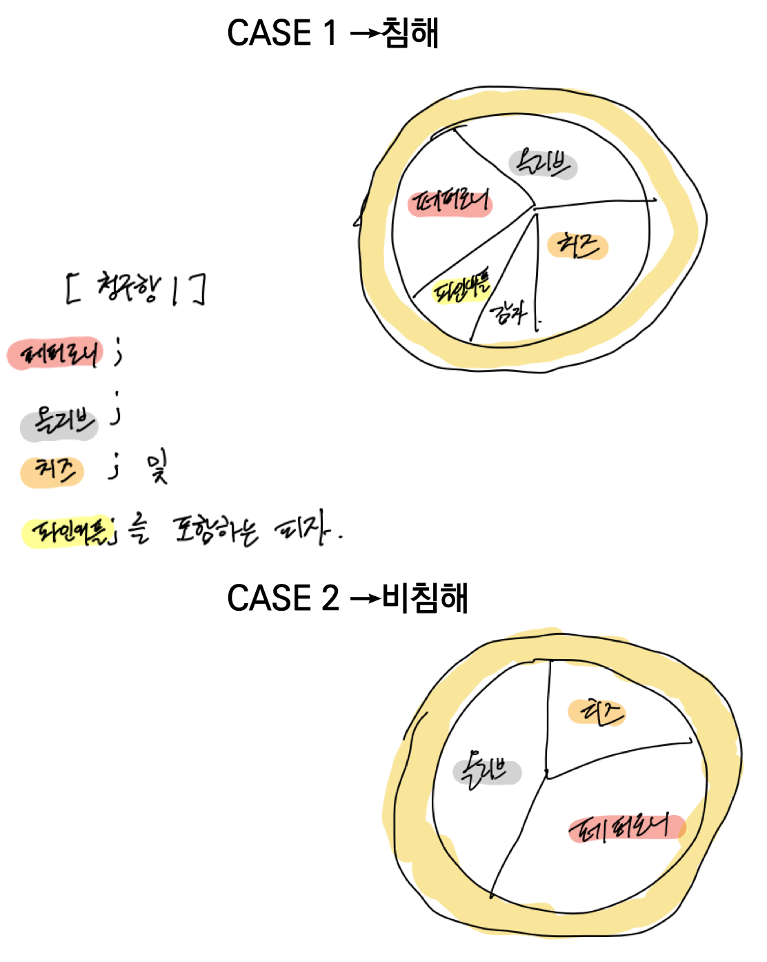 NPE의 특허 문서에 그림 2와 같은 피자 청구항이 적혀있고 회사가 두 가지 case로 피자를 만든다고 가정해보자.