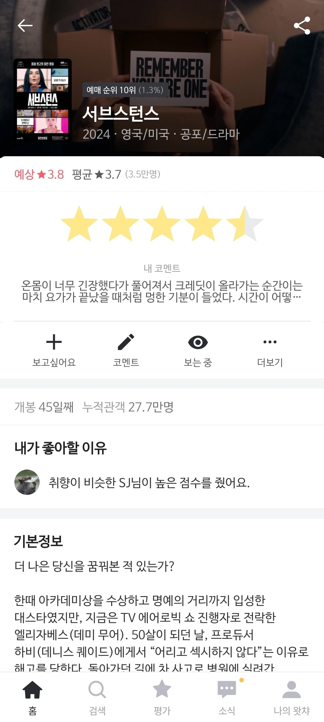 외모에 대한 자신감은 시기마다 달랐지만, 외모 때문에 큰 불이익을 받고 살지도 않았고 아직 노화를 겪지도 않았다. 그럼에도 나는 왜 수가 아닌 엘리에게 더 많은 공감을 했던 걸까? 엘리가 아닌 수에게 감정이입하는 젊은 여성도 있을까? 영화를 본 많은 여성들과 대화를 해보고 싶다.