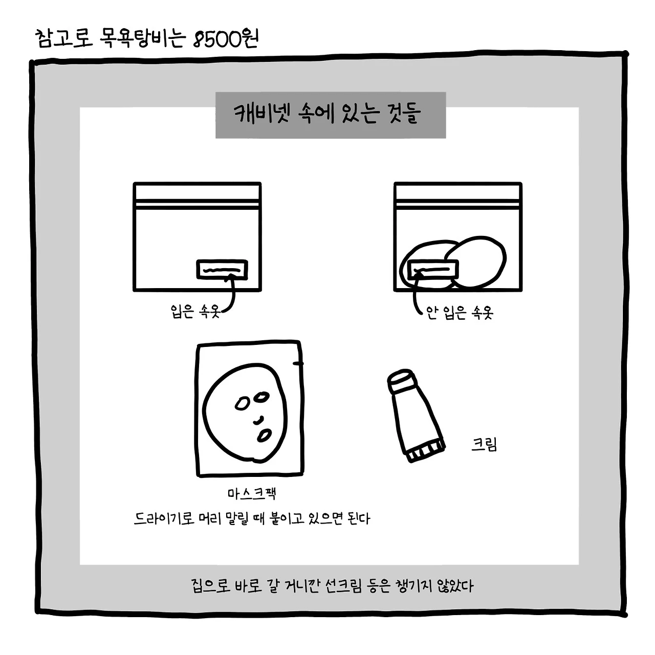 남들 다 벗은 공간에서 혼자 얼굴을 덮는 건, 조금은 웃긴 일이지만, 팩을 하고 나면 자신을 돌봤다는 느낌이 들어서 빼놓을 수가 없다.