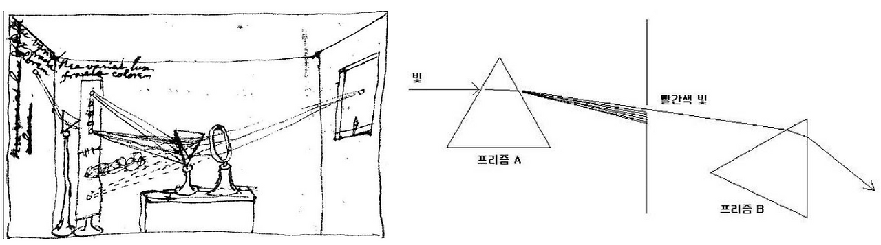 당시 색에 관한 주류의 인식은 아리스토텔레스의 <빛의 변용설>에 근거했다. 그는 빛의 본성이 백색이라고 했다. 그리고 어둠을 도입하면서 빨강, 파랑, 노랑의 색채 차이가 나타난다고 보았다. 즉 색은 빛과 어둠의 혼합 상태에서 결정된다는 뜻이다. 이 사변적 논리에 도전한 이가 바로 뉴턴이다. 그는 세상의 모든 색깔이 빛 안에 숨어 있다는 사실을 알아냈다. 데카르트의 광학 실험을 발전시켜 프리즘에 빛줄기를 통과시키면서 그 거리를 늘여갔다. 그러자 6.6m 떨어진 벽에 투사된 빛의 연속 스펙트럼에서 일곱 가지 무지개색이 관찰되었다. 무색의 빛이 이미 빨주노초파남보의 모든 색을 품고 있었던 것이다. 프리즘의 두께와 각도를 바꿔보고, 창(窓)의 구멍 크기를 조절해 빛의 양도 달리해 봤다. 아리스토텔레스가 말하는 ‘어둠의 양에 따른 색채 차이’는 어떤 실험에서도 발견할 수 없었다.