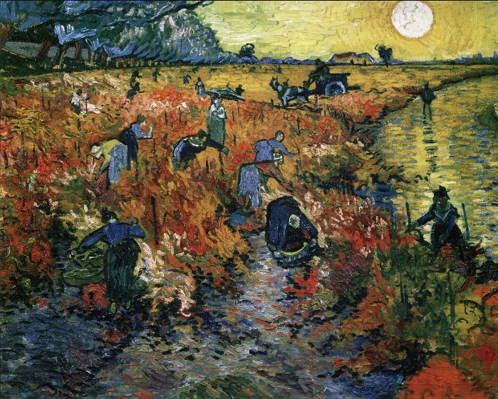 로트레크가 초대한 1890년 1월, '20인 그룹 정기전'에 고흐가 전시했던 작품이 <아를의 붉은 포도밭>이다. 석양의 노란빛이 멀리 퍼지며 포도밭을 더 붉게 물들이는 장면을 그렸다. ‘붉은 포도밭’은 아를에서 고갱과 함께 ‘노란 집’에서 지낼 때 집중한 주제였다. 존경했던 고갱의 영향으로 다른 작품과는 달리 캔버스를 매끈하게 채색했다. 고갱에게서 나타나는 평면성이다. 한편 이 그림은 고흐의 생전에 팔린 유일한 작품이기도 하다. 친구이자 화가이며, 또 시인인 외젠 보크의 누이 안나 보크가 고흐가 죽기 5개월 전 400프랑(한화 약 100만 원)에 샀다.