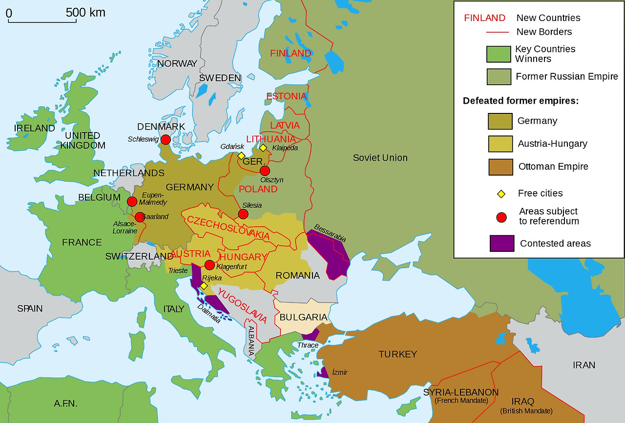 제1차 세계대전에서 연합국이 승리했다. 1919년 초청받지 못한 소비에트를 제외한 전승국 27개국이 참가한 가운데 파리 강화회의가 열렸다. 그리고 사회민주당이 집권한 독일의 새로운 정권이 베르사유 조약을 수락했다. 프랑스는 베르사유 궁전 ‘거울의 방’에서 패전국 독일과 조약을 체결함으로써 자존심과 함께 보불 전쟁 이전의 국경을 회복했다. 그리고 조약을 통해 이익을 취한 국가들과 블록을 형성했다. 500년 역사를 자랑하던 오스트리아-헝가리 제국이 쪼개졌는데, 새로 독립한 체코슬로바키아와 유고슬라비아, 헝가리 왕국의 동부 지역을 차지한 루마니아가 이에 포함된다.